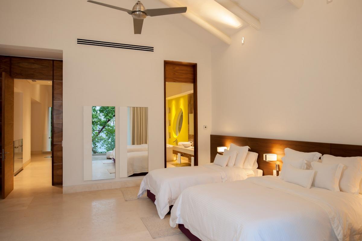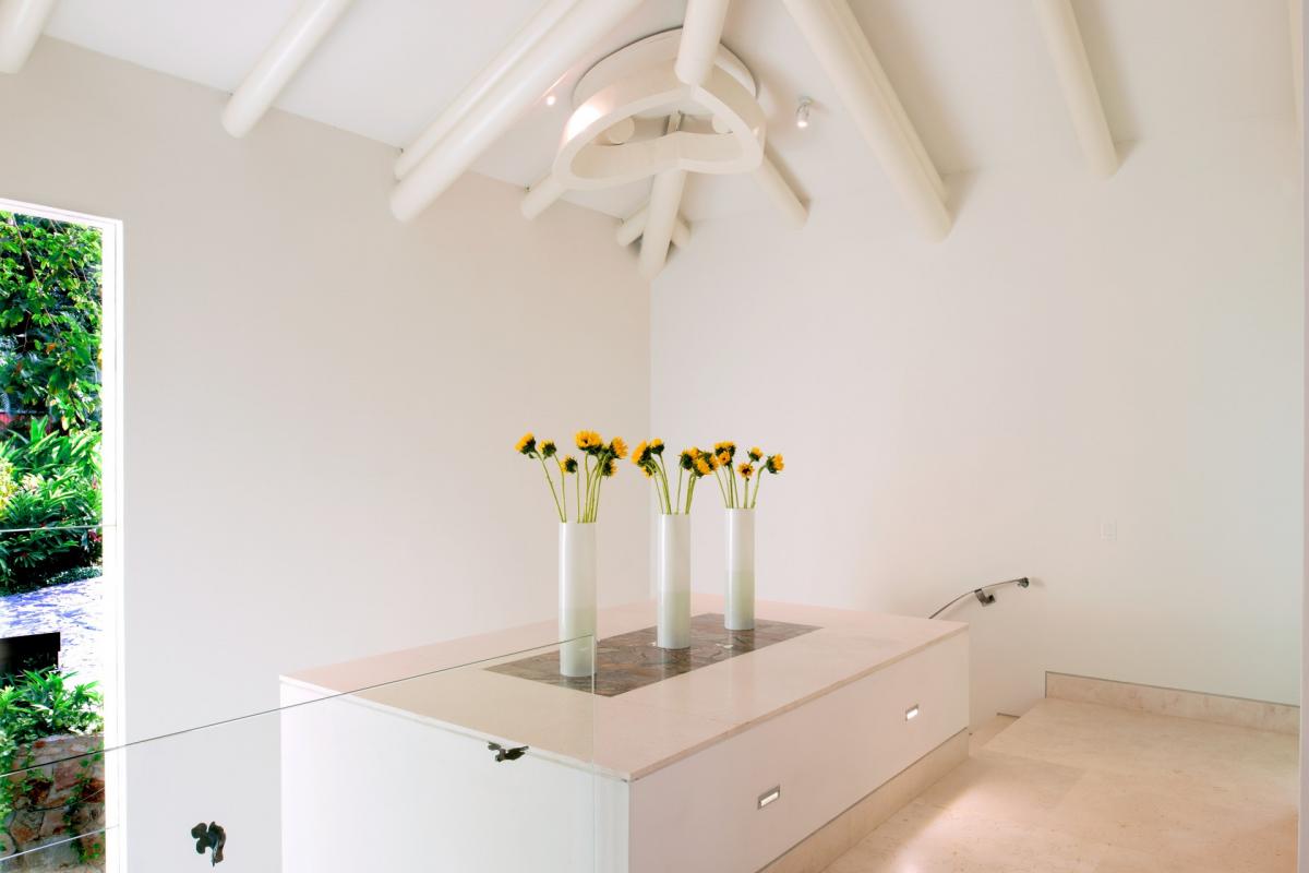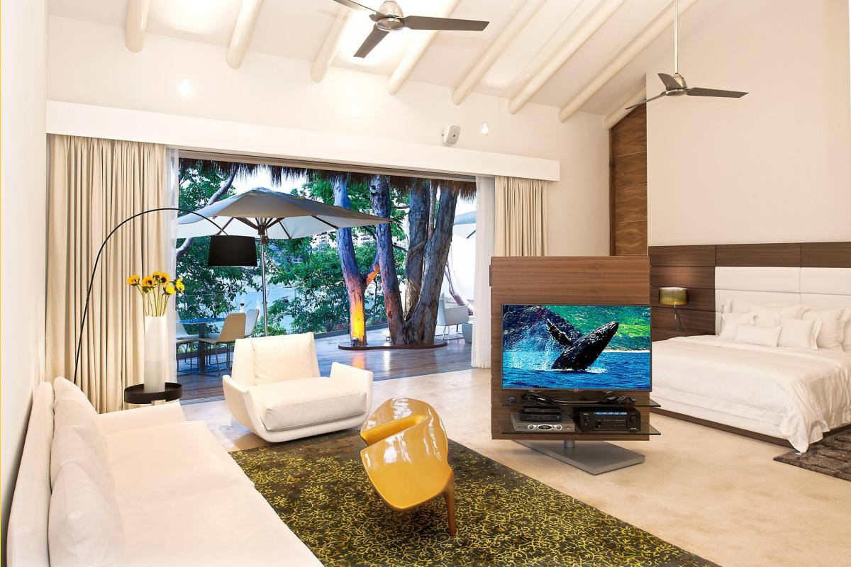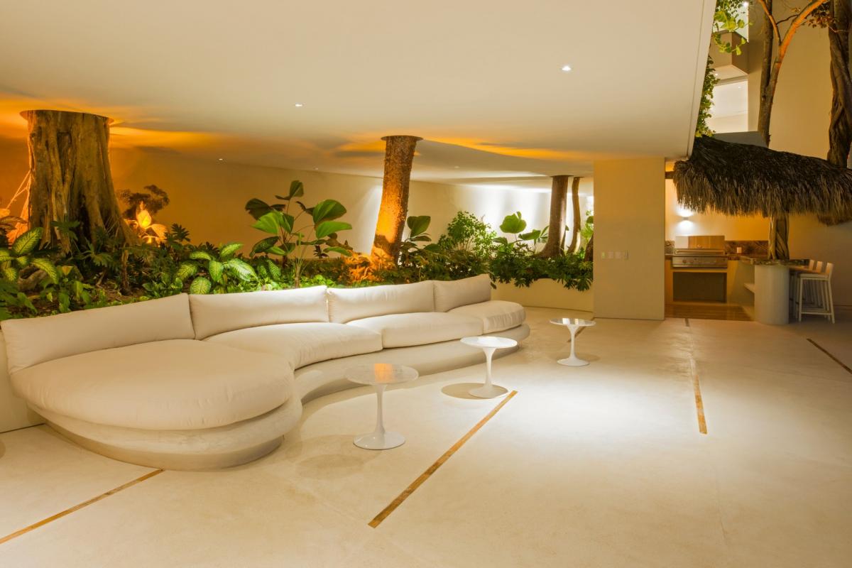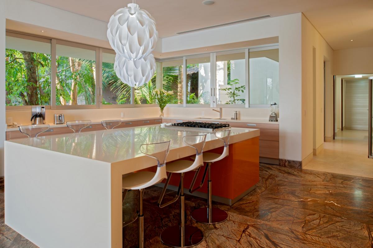 Casa Papelillos is a unique mix of sleek contemporary furnishings and natural features. Trees growing through the oceanfront balconies have been left intact, making the open-plan living areas feel as though they’ve grown out of the landscape. In the living room, clean-lined white seating is cool and modern, while pops of color like a red carpet and yellow cushions add a whimsical touch. A statement stone dining table has room for twelve, and the fully equipped kitchen has a spacious breakfast bar.