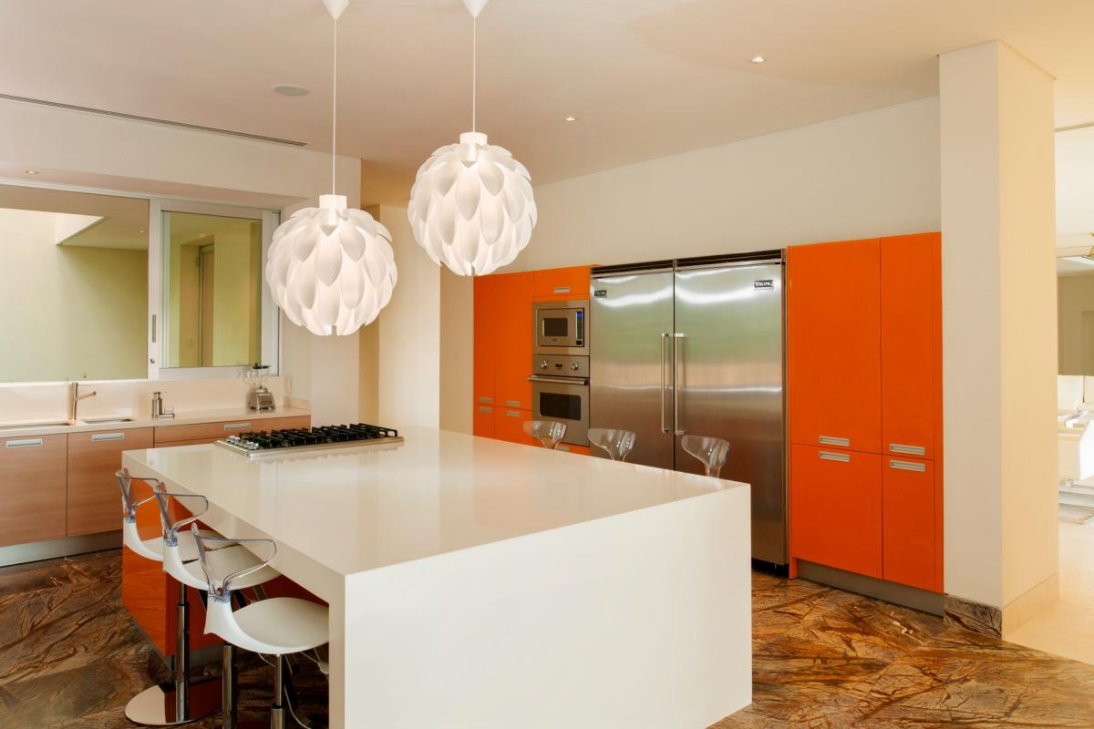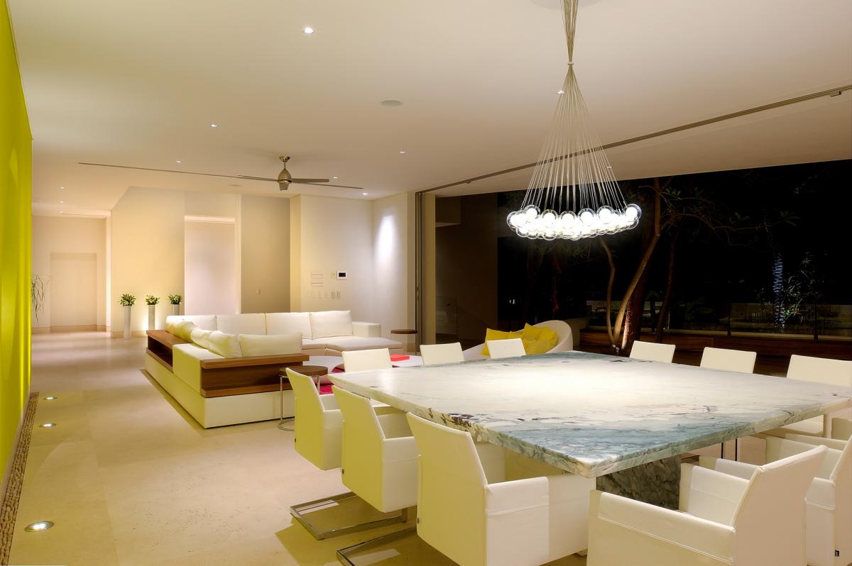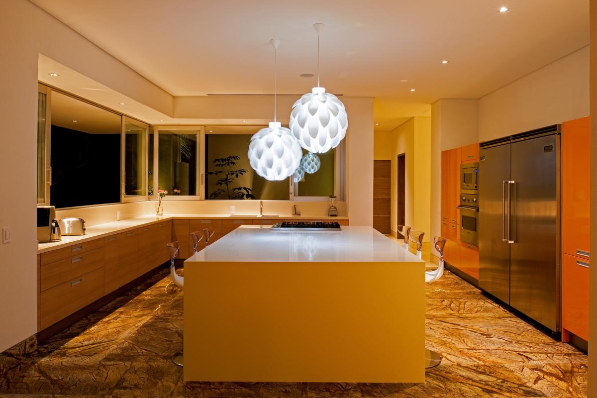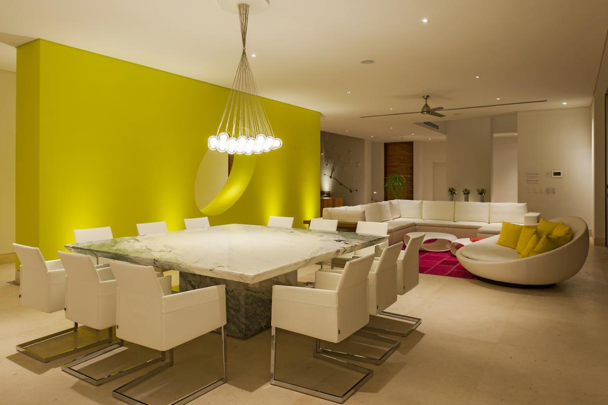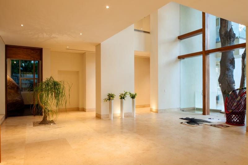 Casa Papelillos is a unique mix of sleek contemporary furnishings and natural features. Trees growing through the oceanfront balconies have been left intact, making the open-plan living areas feel as though they’ve grown out of the landscape. In the living room, clean-lined white seating is cool and modern, while pops of color like a red carpet and yellow cushions add a whimsical touch. A statement stone dining table has room for twelve, and the fully equipped kitchen has a spacious breakfast bar.