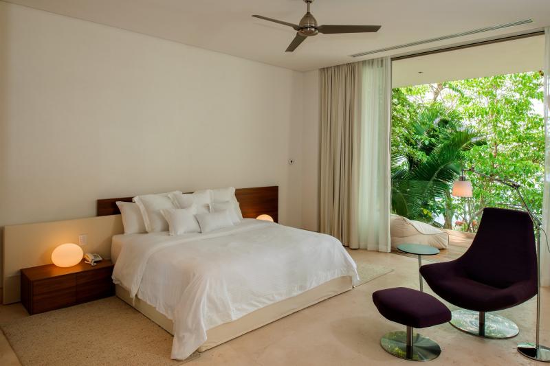 Bedroom 1: Primary with king bed, en suite bathroom with shower, bathtub and bidet, in room air, ceiling fans, TV, Blueray DVD player, sound system, telephone, interphone, safe, walk-in closet, access to terrace, ocean view