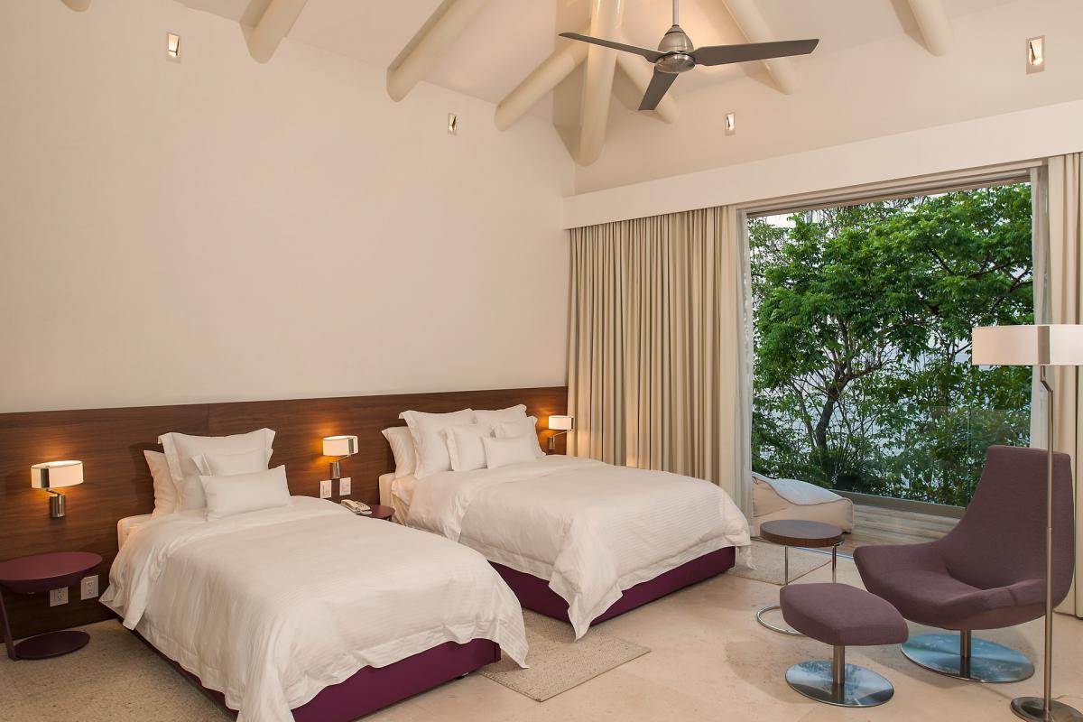 Bedroom 2: Two queen beds, en suite bathroom, in room air, ceiling fans, TV, Bluray DVD player, telephone, interphone, walk-in closet, balcony, ocean and pool view