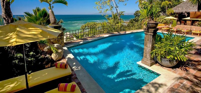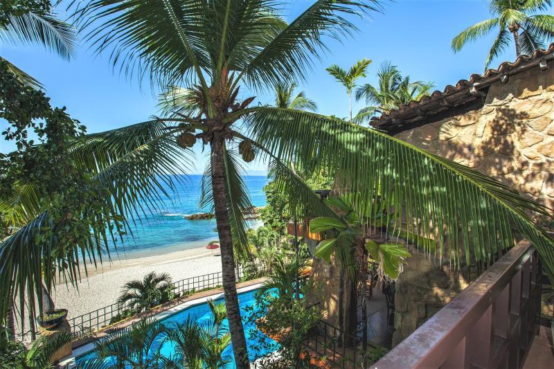 Casa Septiembre is one of our favorite beach houses in Puerto Vallarta. Featuring 9 bedrooms, it is one of the few large villas near Old Town that has a wide sandy beach below the pool. The ambiance is ultra exotic and relaxed. Lush gardens create a private enclave. The backdrop of white sand, swaying palm trees and aquamarine waters has been described by guests as “a Hollywood set”. When you find the strength to pry yourself away from this idyllic setting, the popular tourist districts in Old Town are less than 5 minutes in a taxi or 15 minute hike along the spectacular Conchas Chinas coastline.