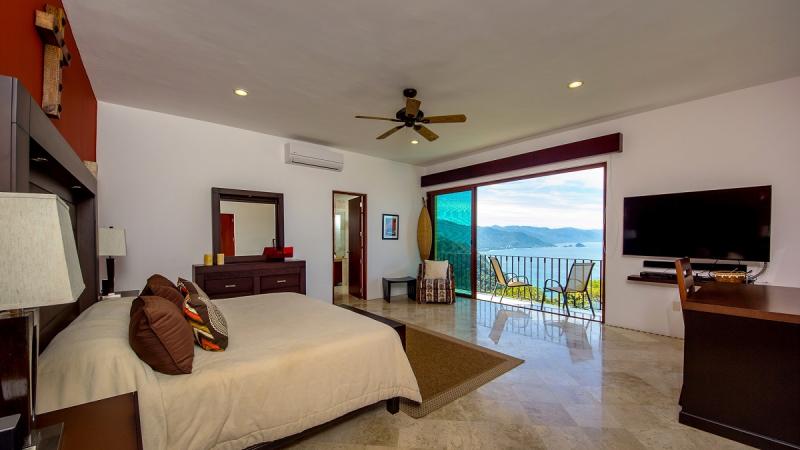 Bedroom 1: King bed, en suite bathroom, AC, fan, ocean view