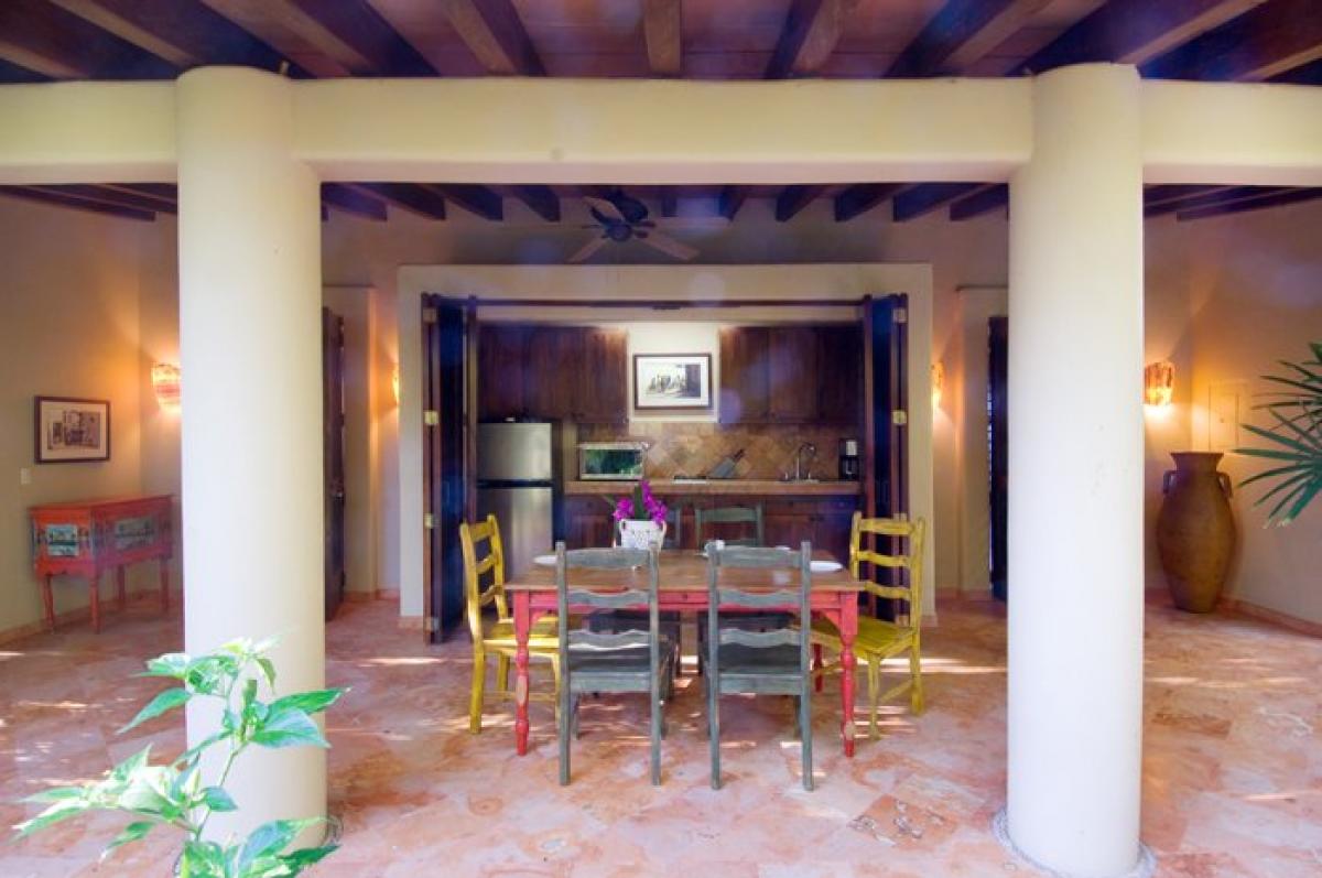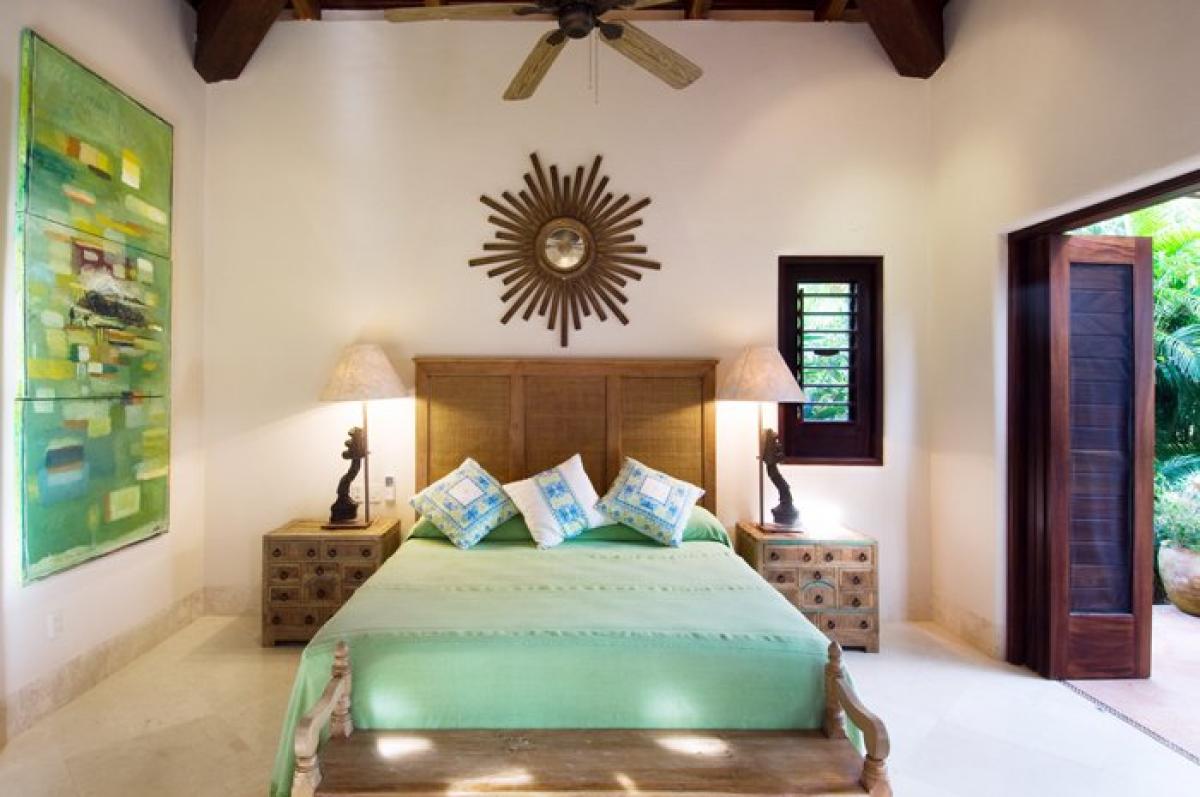 Upon entry to Casa Christina, the grand private garden estate features over 100 magestically towering palms, plus hundreds of smaller palms, trees, flora, and fauna. Facing south overlooking Banderas Bay, this Punta Mita villa's main 2 story house has its principal rooms, the living room, dining room, kitchen, outdoor eating/BBQ area, office, and media room, all on the main level facing a garden. Clever landscaping provides maximum privacy. A stand alone guest bungalow, Casita Christina, contains 2 separate bedroom suites, each with 2 queen beds, private terraces, and ensuite baths. The bungalow also comes with its own fully equipped kitchenette and covered casual dining area. Off the pool deck is a Mexican marble terrace connecting two bungalows, each containing a master bedroom suite with pergola covered terraces, separated by a garden and fountain.