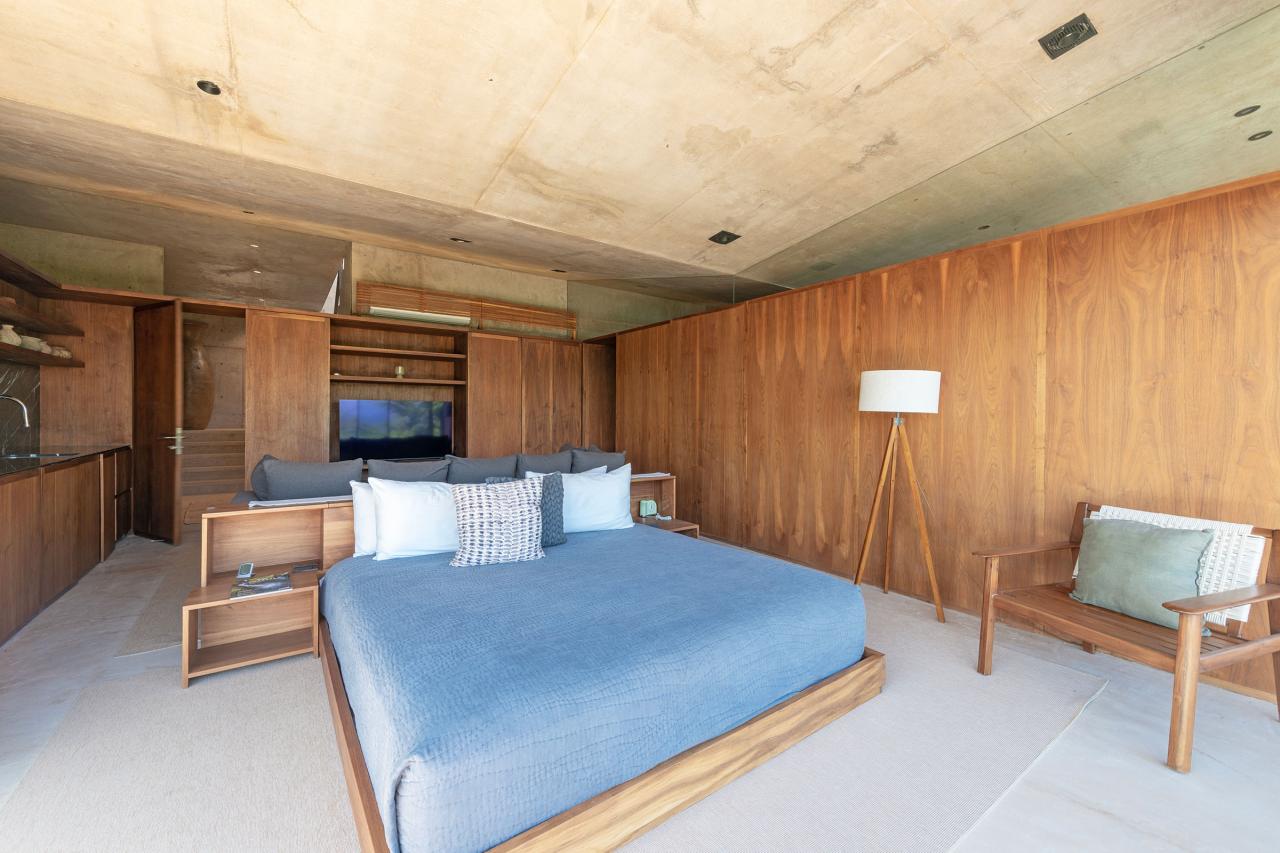 Primary Bedroom: This room has a king-sized bed, a TV, a mini-fridge, and an ocean view. The Primary Bedroom also has an ensuite bathroom with an ocean-view shower.