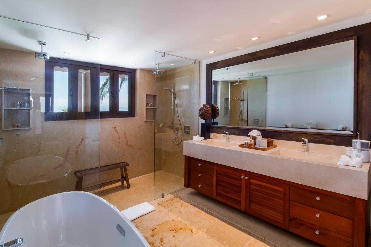 - Bedroom 1: Primary with king bed, 60" tv, en suite bathroom with double vanities, bathtub and two rain showers, walk-in closet, safe, private balcony, ocean view