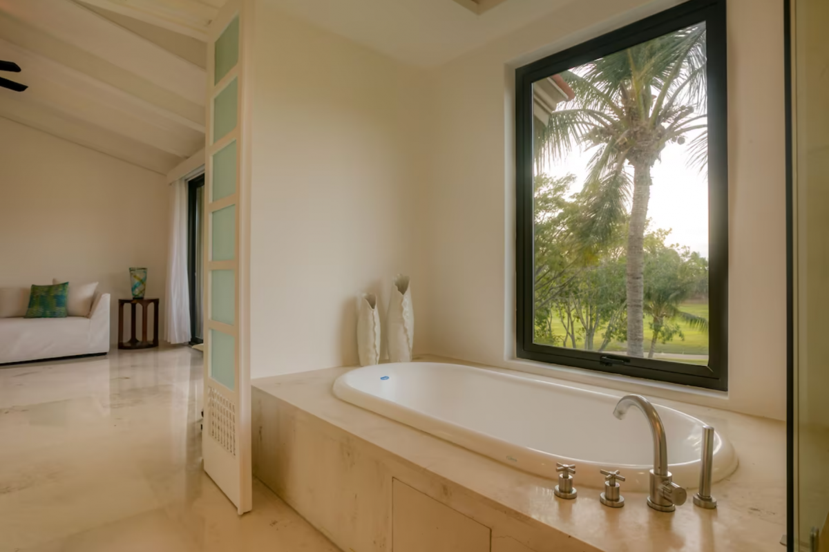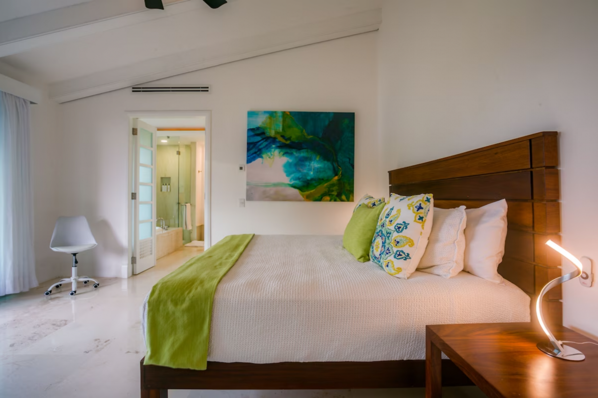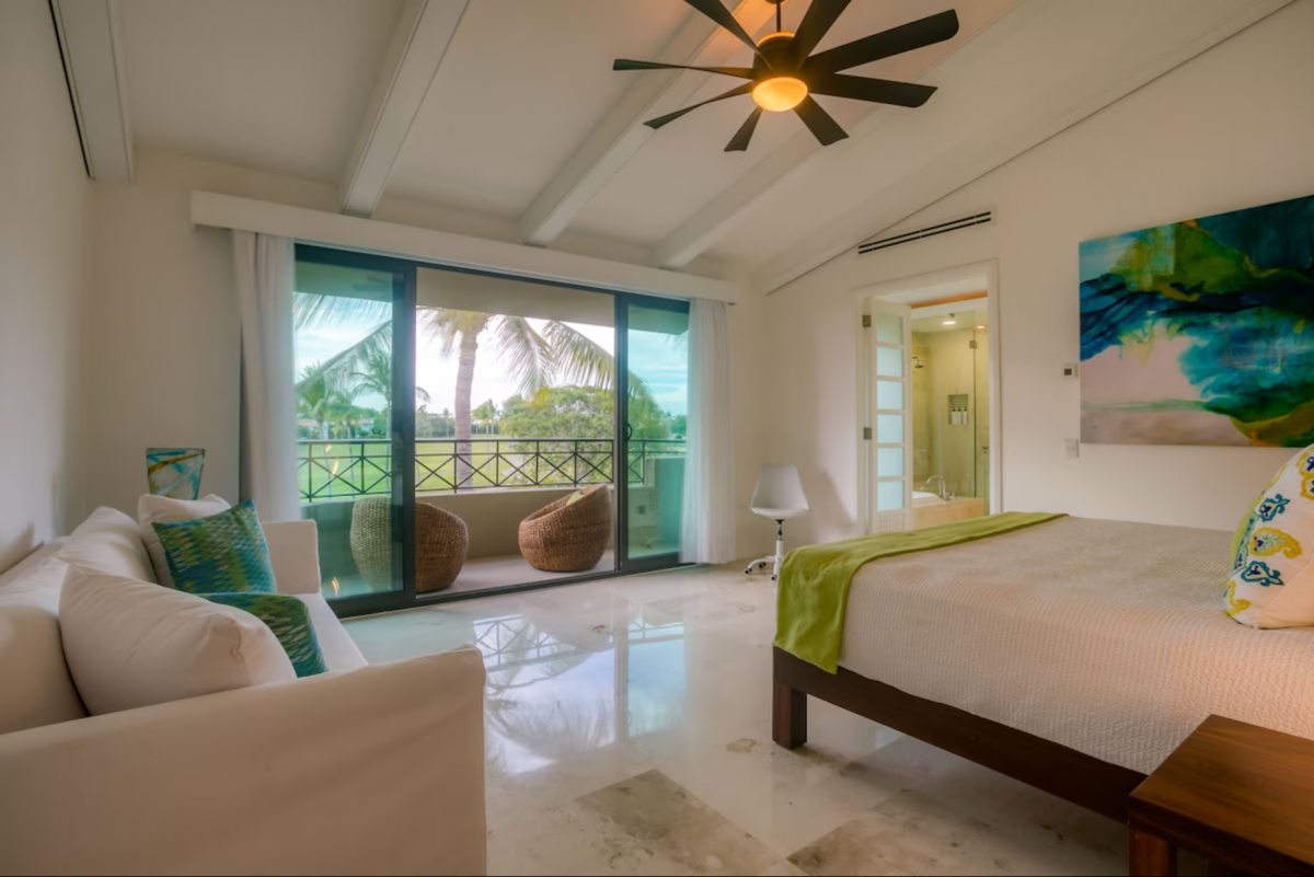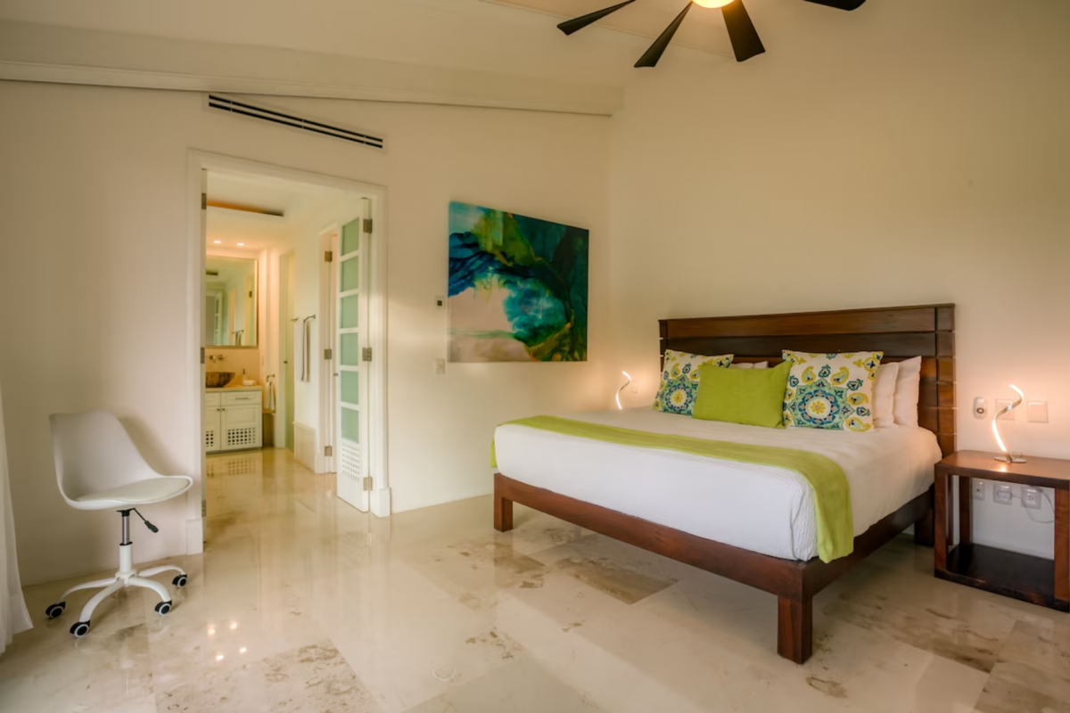 Primary Bedroom: The Primary Bedroom is equipped with a king-sized bed, a TV, air conditioning, and an ensuite bathroom.
