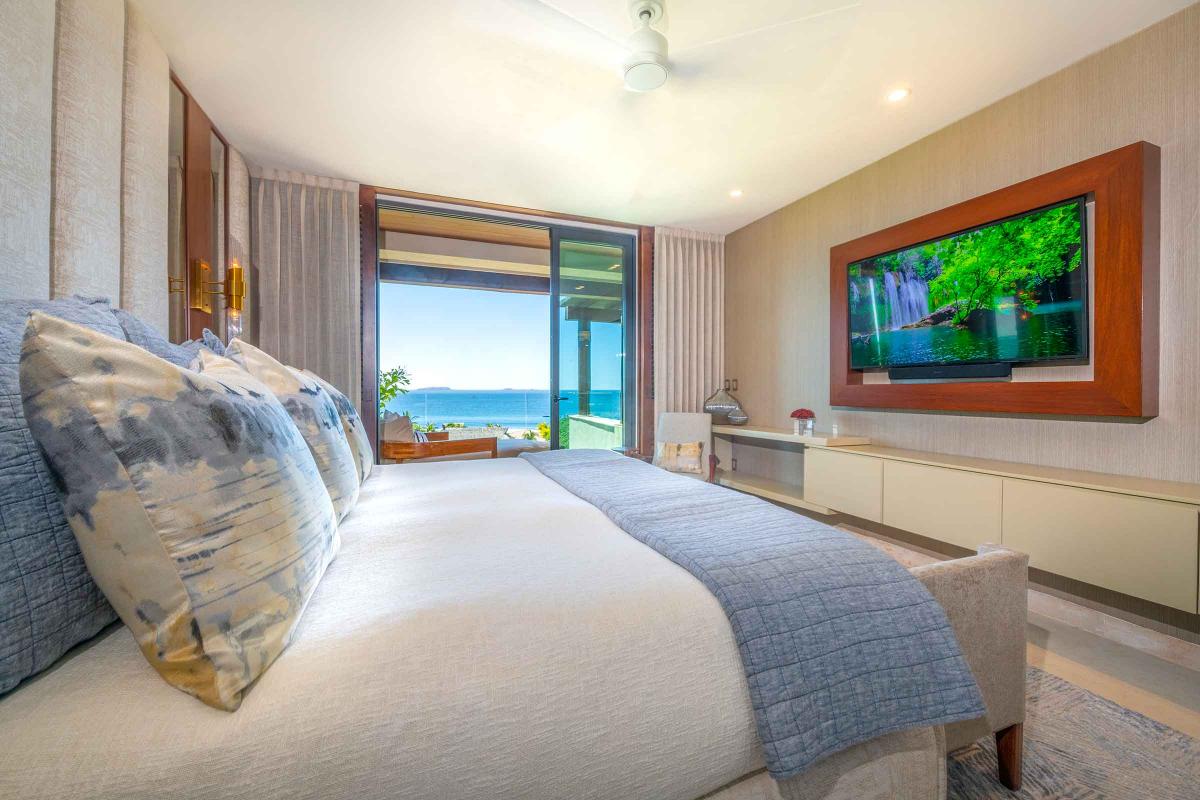 Primary Bedroom: The Primary Bedroom is equipped with a king-sized bed, a TV, a ceiling fan, air conditioning, a private patio with an ocean view, and an ensuite bathroom with a double shower.