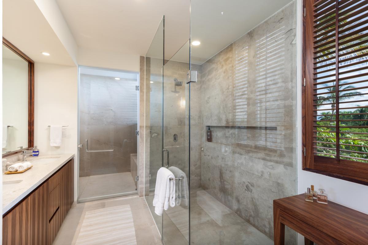 Primary Bedroom: King-sized bed with an ensuite bathroom equipped with an indoor and outdoor shower.