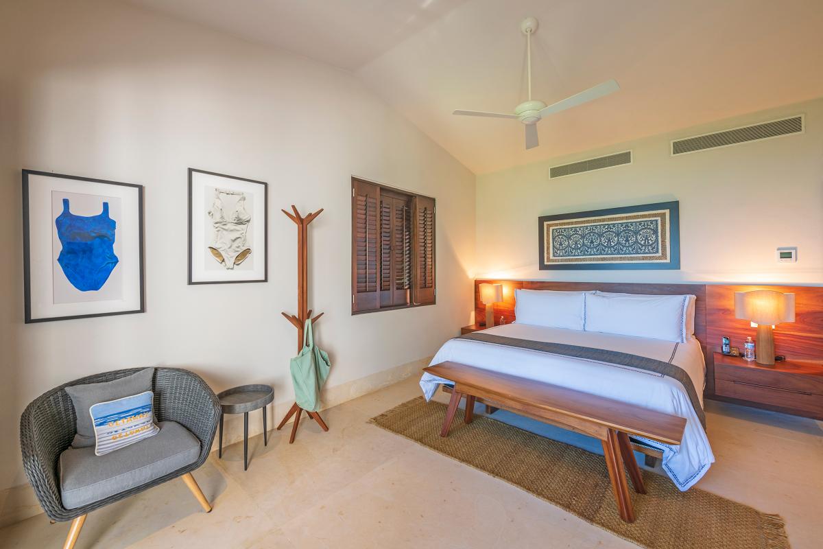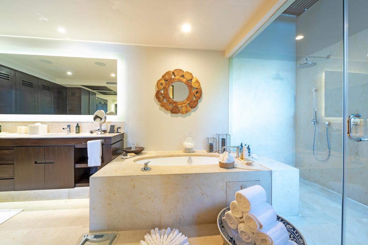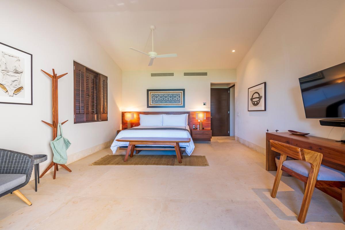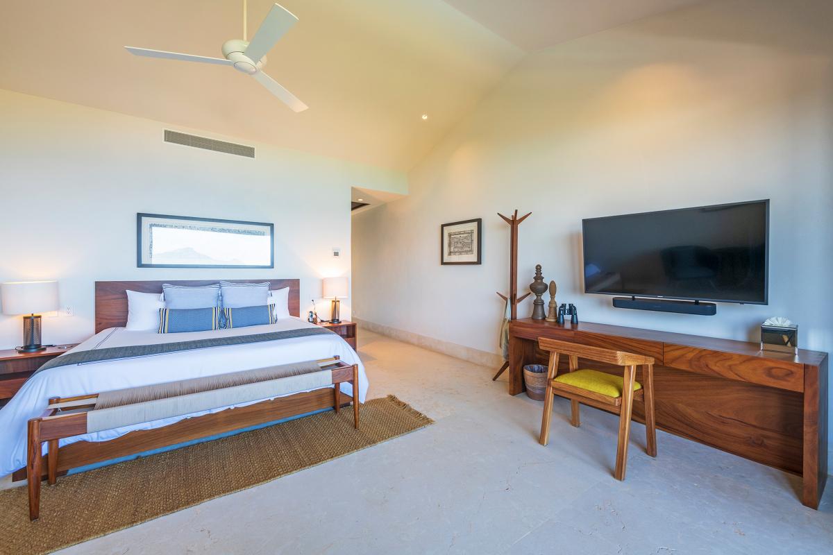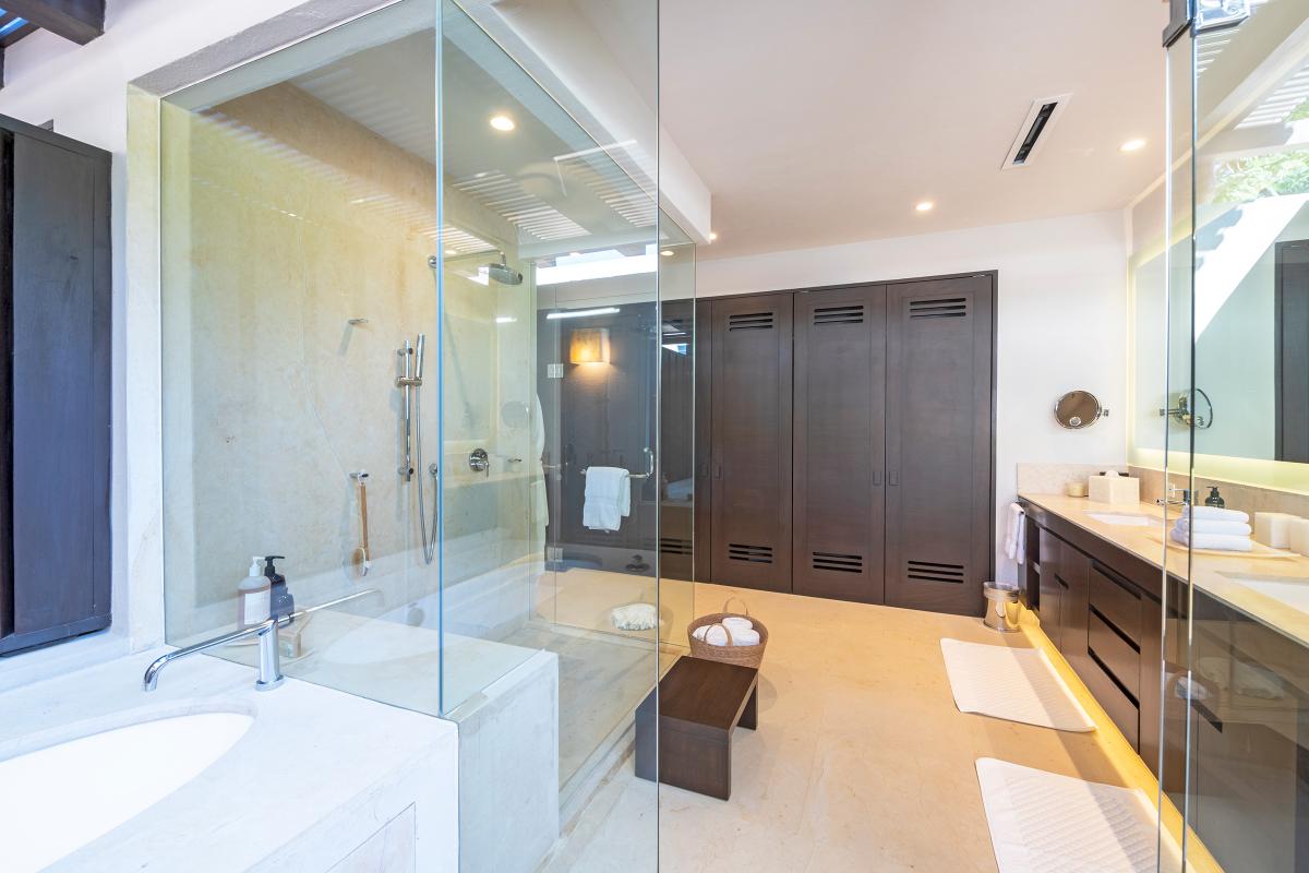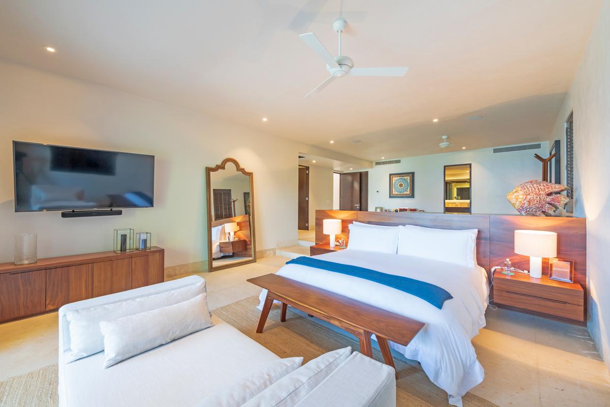 Primary Bedroom: This room is equipped with a king-sized bed, a terrace with an ocean view, a sitting area, a closet, a TV, air conditioning, and a private bathroom with a bathtub.