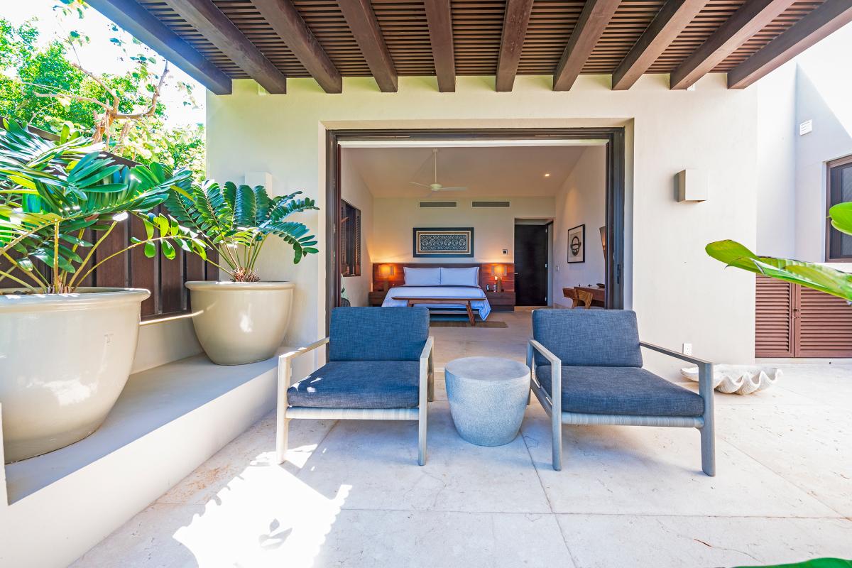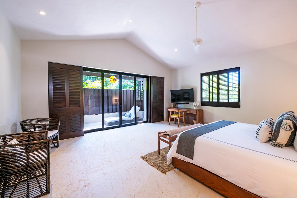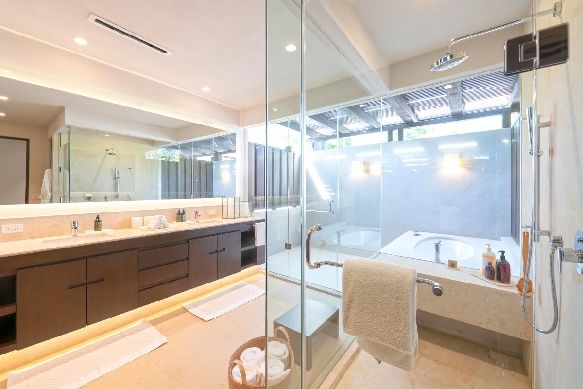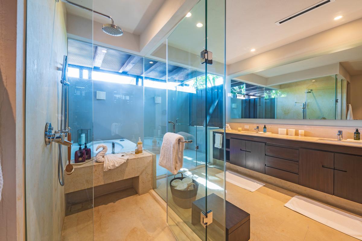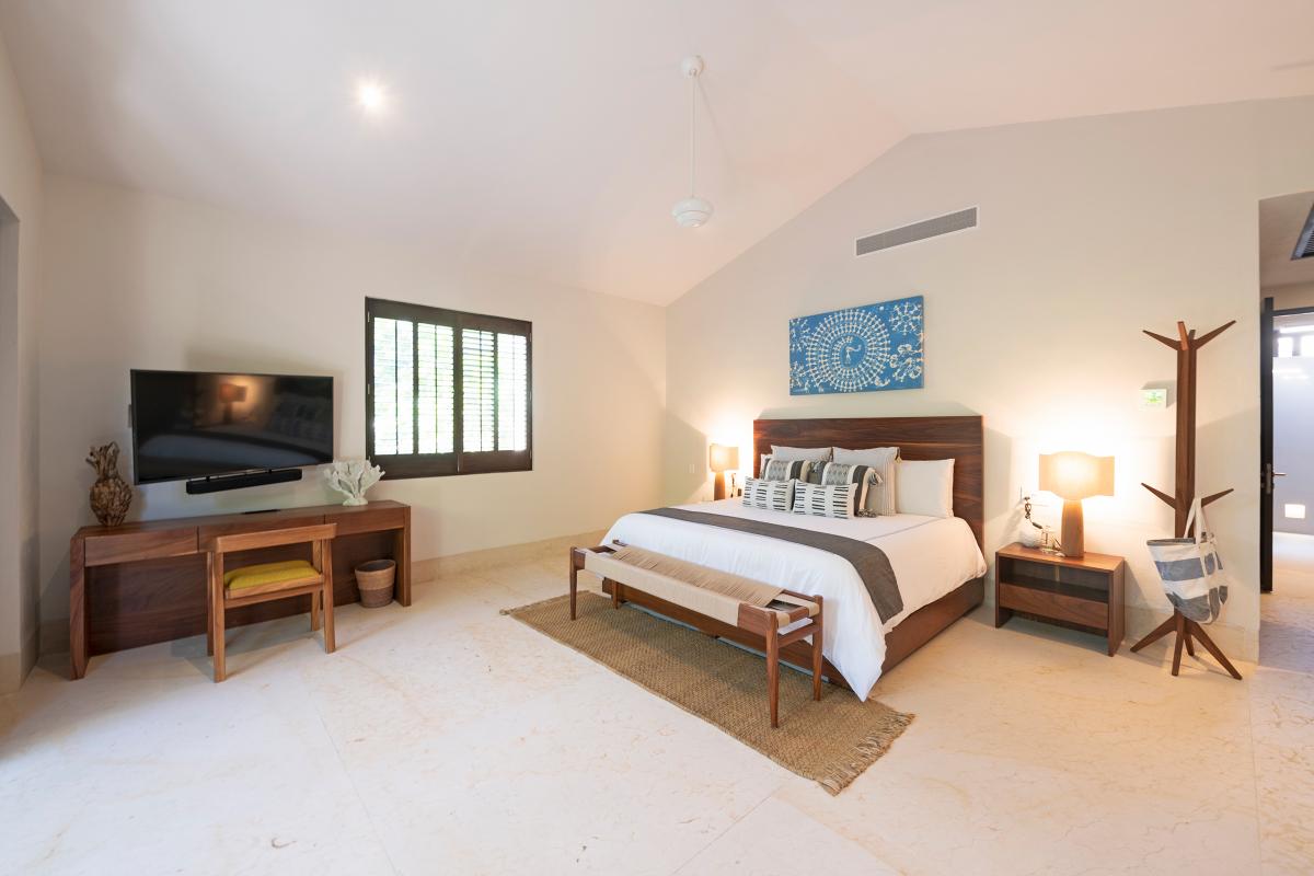 Primary Bedroom: This room is equipped with a king-sized bed, a terrace with an ocean view, a sitting area, a closet, a TV, air conditioning, and a private bathroom with a bathtub.