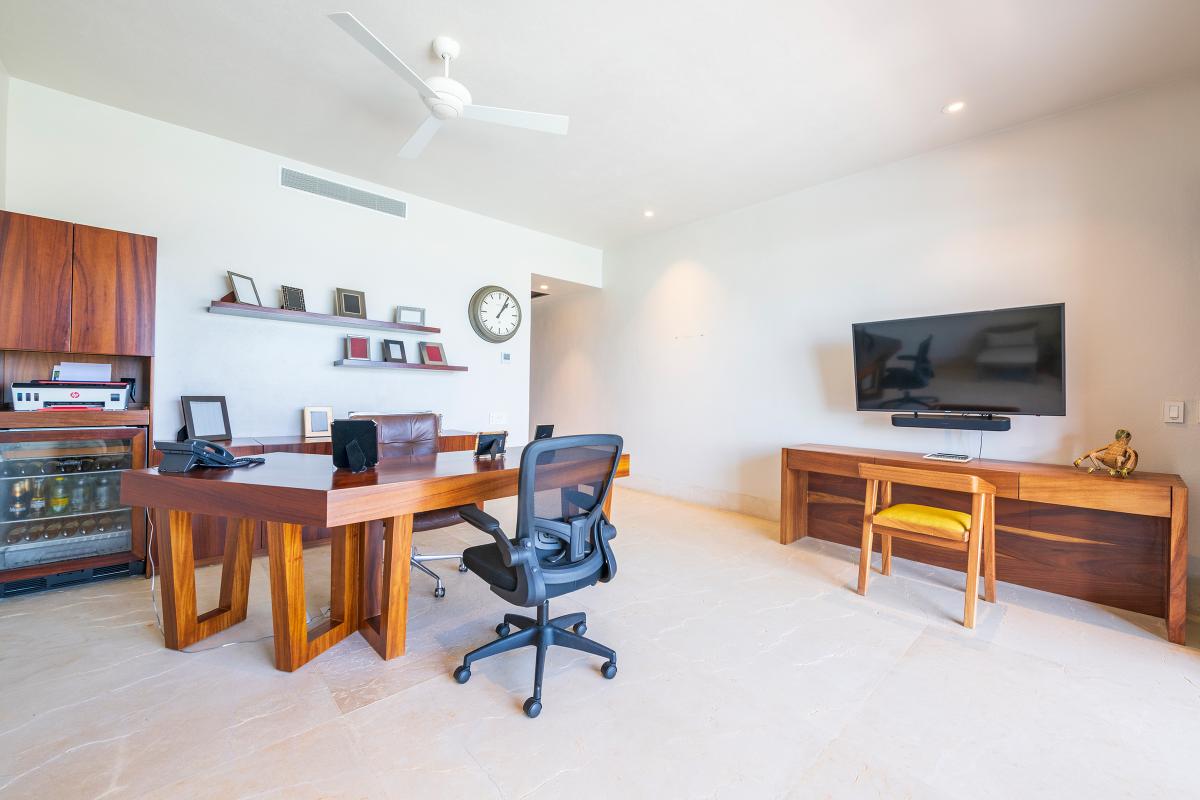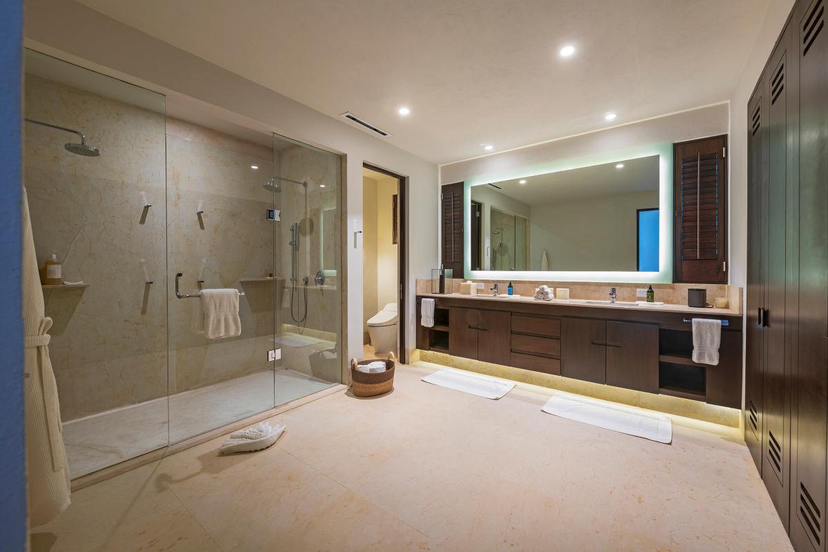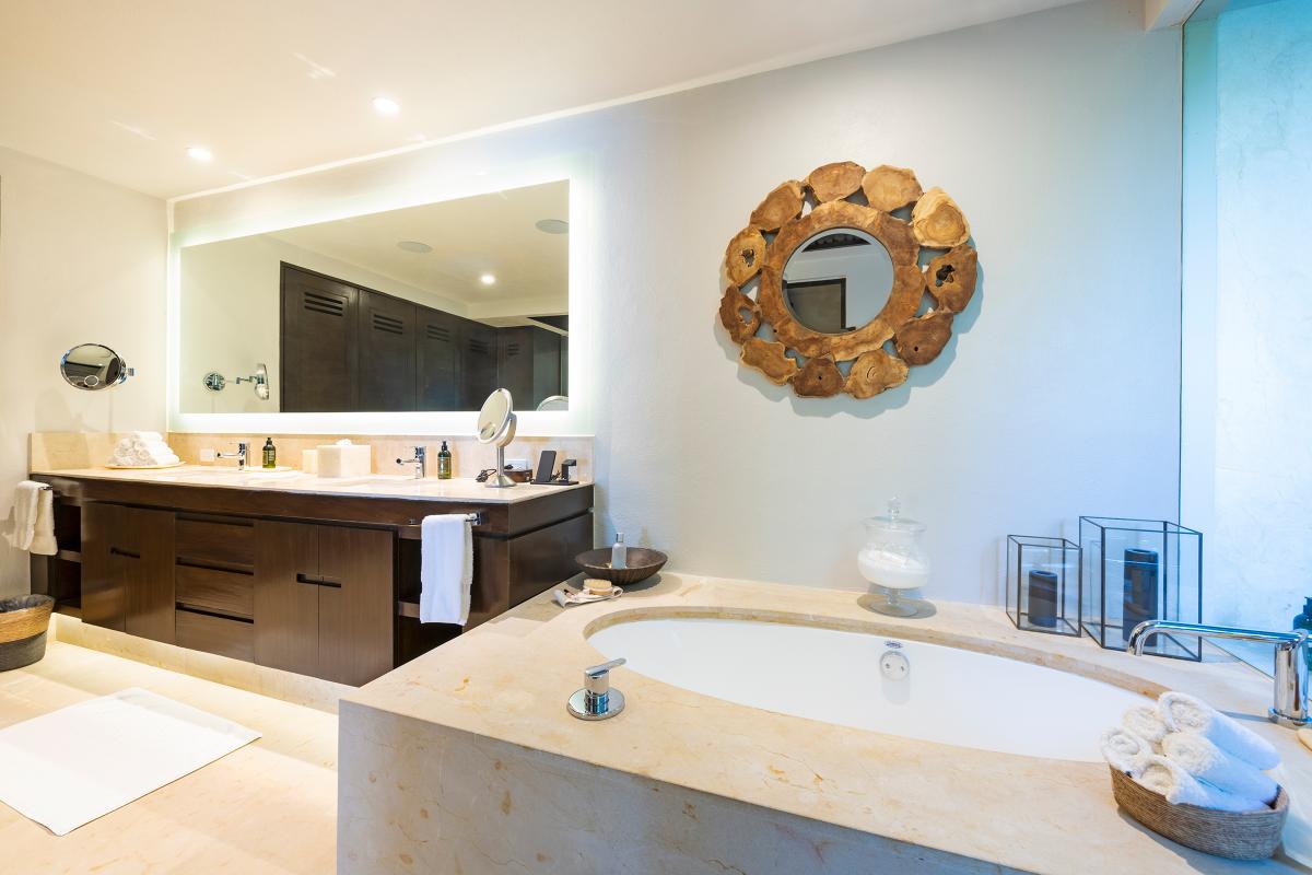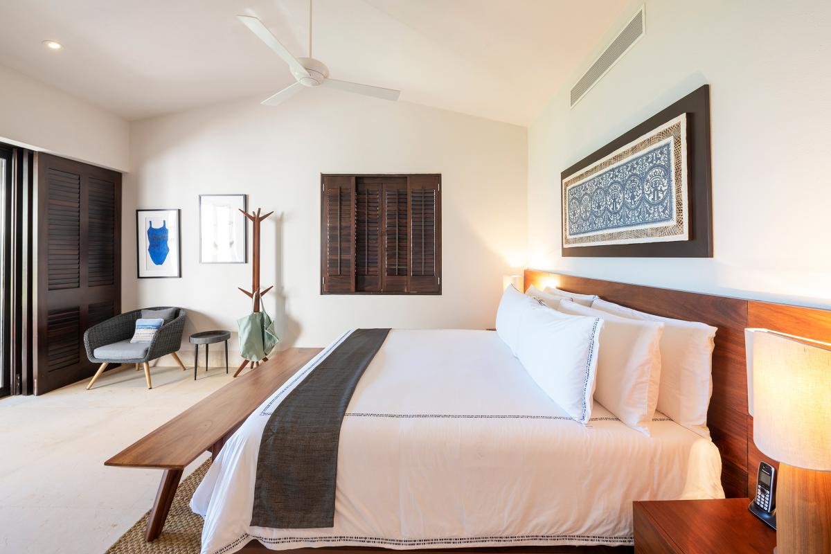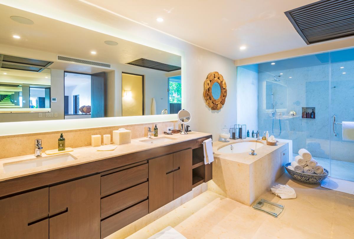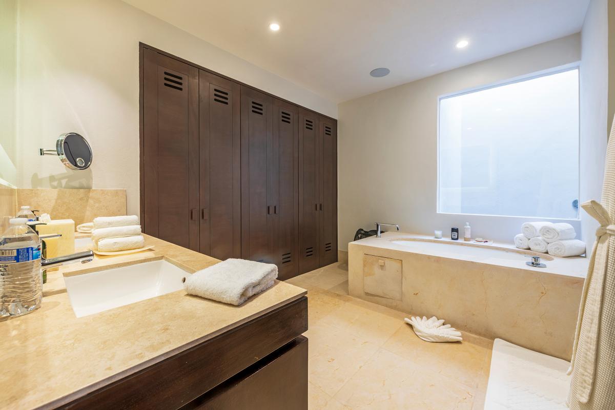 Primary Bedroom: This room is equipped with a king-sized bed, a terrace with an ocean view, a sitting area, a closet, a TV, air conditioning, and a private bathroom with a bathtub.