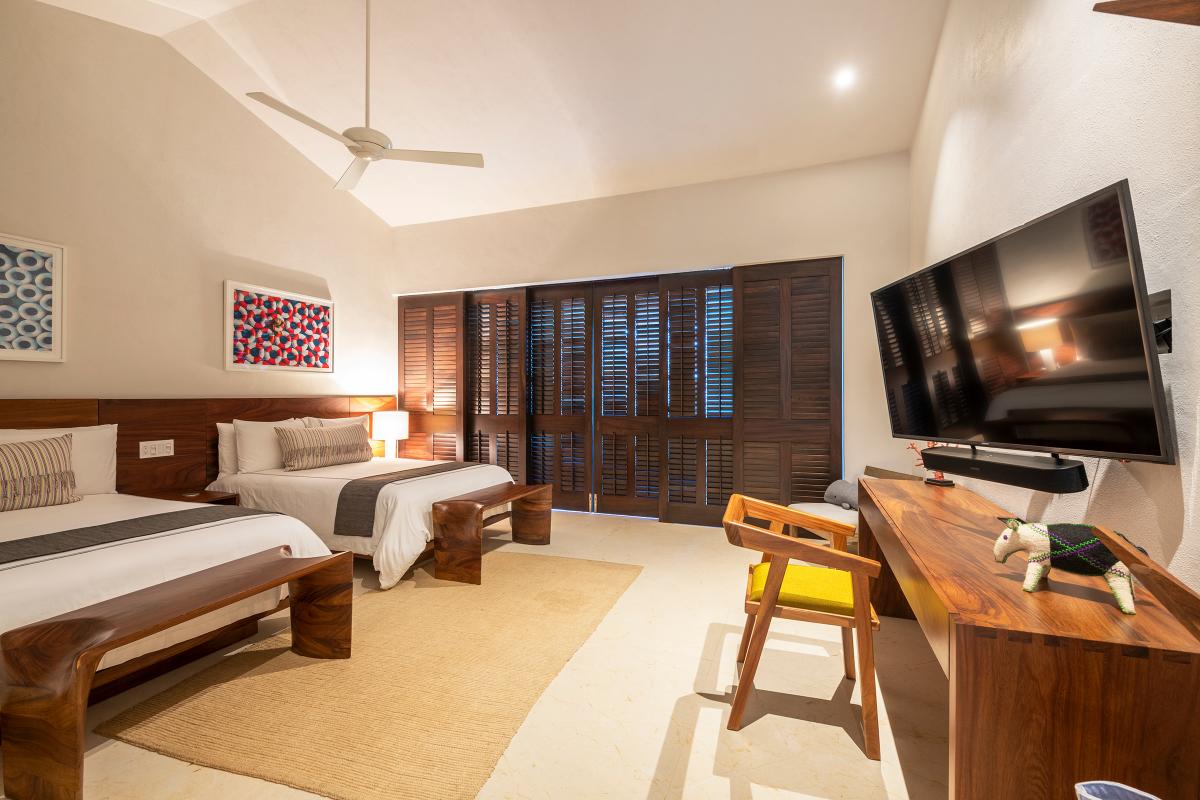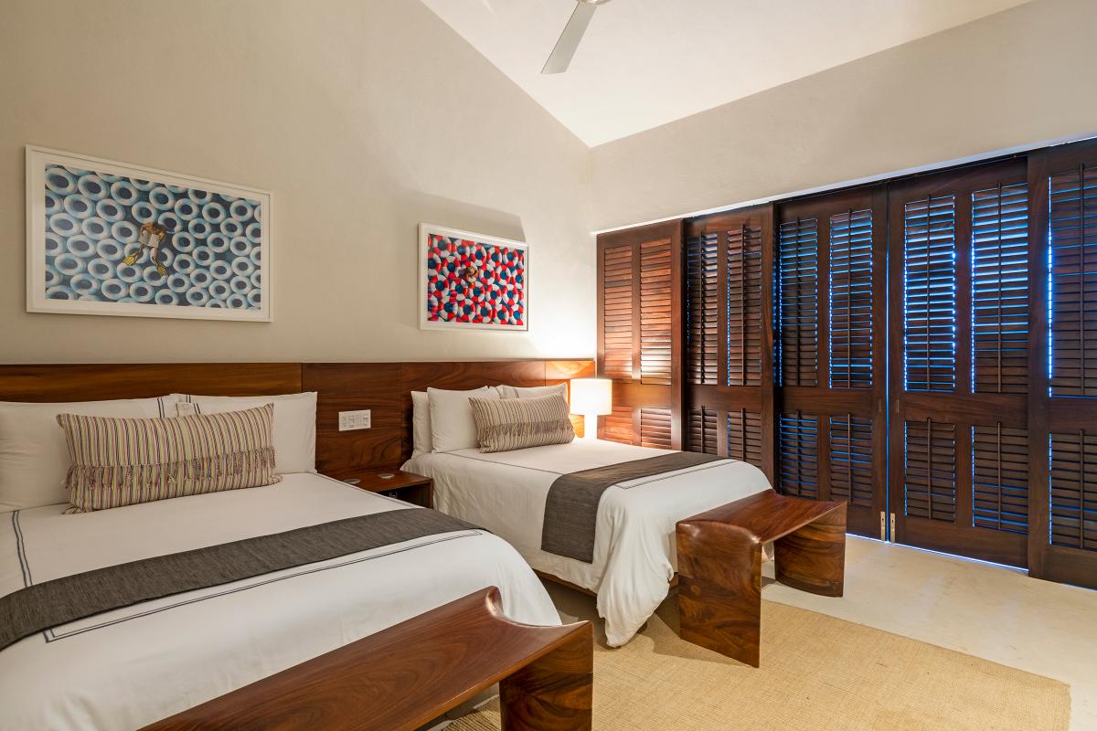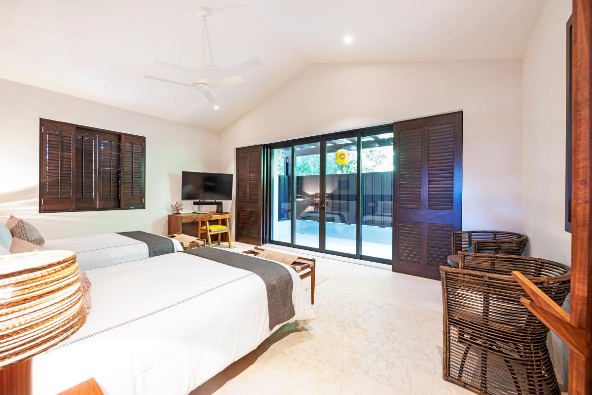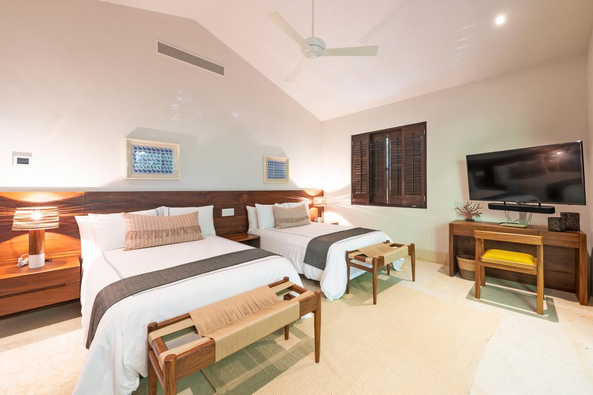 Bedroom 5: This room is equipped with two double-sized beds, a terrace with an ocean view, a TV, a closet, air conditioning, and a private bathroom.