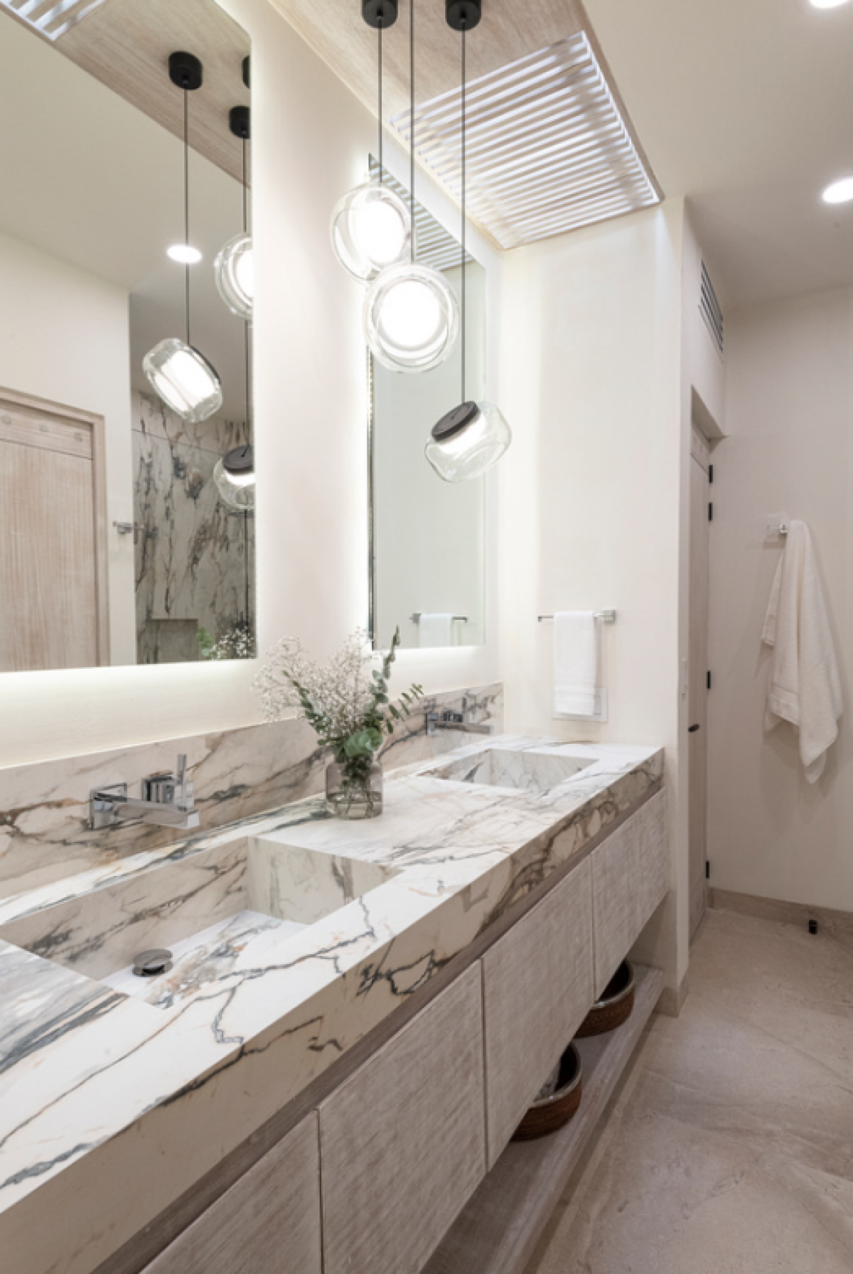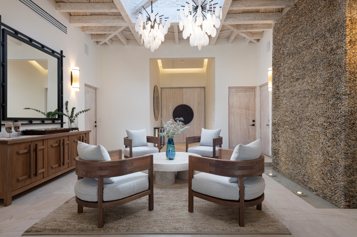 Situated within the esteemed Las Palmas Punta Mita residential gated community and just a brief stroll from sandy beaches, The Sanctuary is the ideal Punta Mita rental for large groups, corporate retreats, or multi-generataional family vacations. Consisiting of two beautiful side by side villas, each with their own private pools, kitchen and dining spaces. Each villa includes 3 bedrooms and 3 baths. The villas offer stunning indiviual designs and decor that include a stone wall feature, grand wooden doors, and a moroccan lighting feature. Large retractable doors from both living areas to the pool areas embody the essence of indoor outdoor living at a Punta Mita vacation.