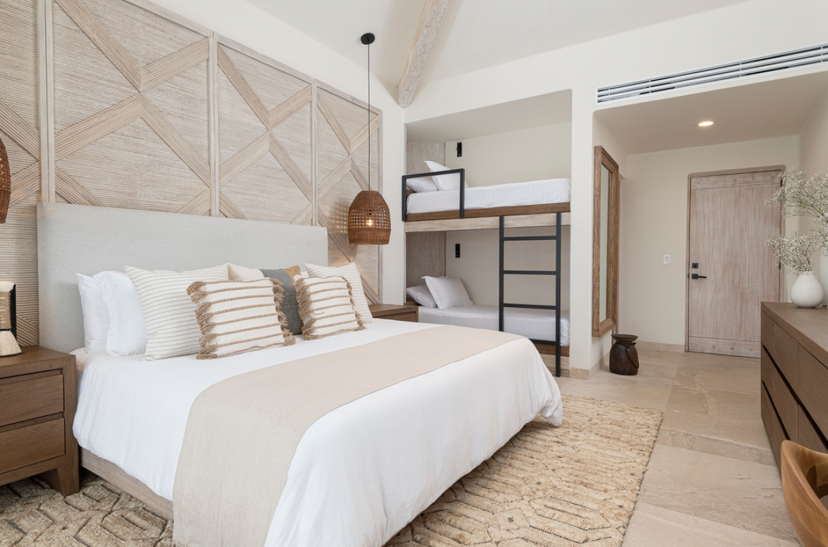 Bedroom 5: Two queen beds and built-in adult-size bunk beds, a poolside terrace, and an ensuite bathroom with a shower.