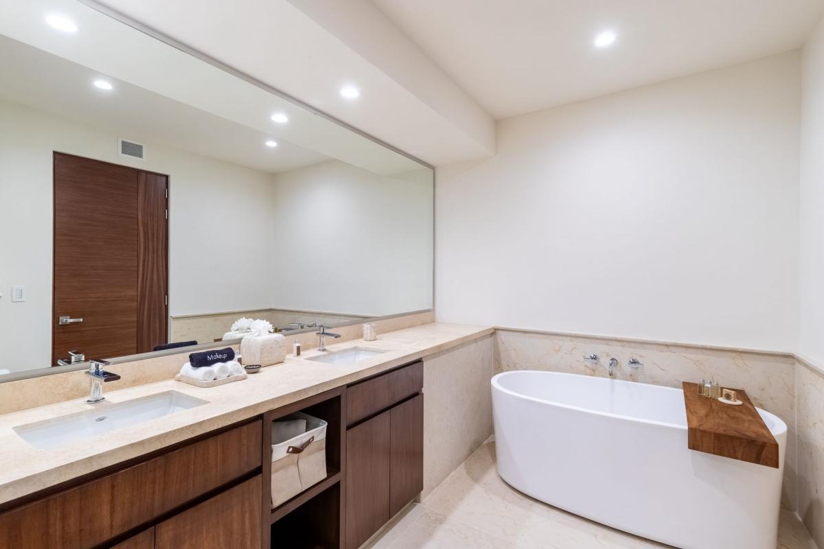 Bedroom 2: 1 King bed, TV, AC, double closet, sofa, dedicated workspace, balcony with pool and ocean view, outdoor furnishings, ensuite bathroom with double vanity, indoor shower, and bathtub.