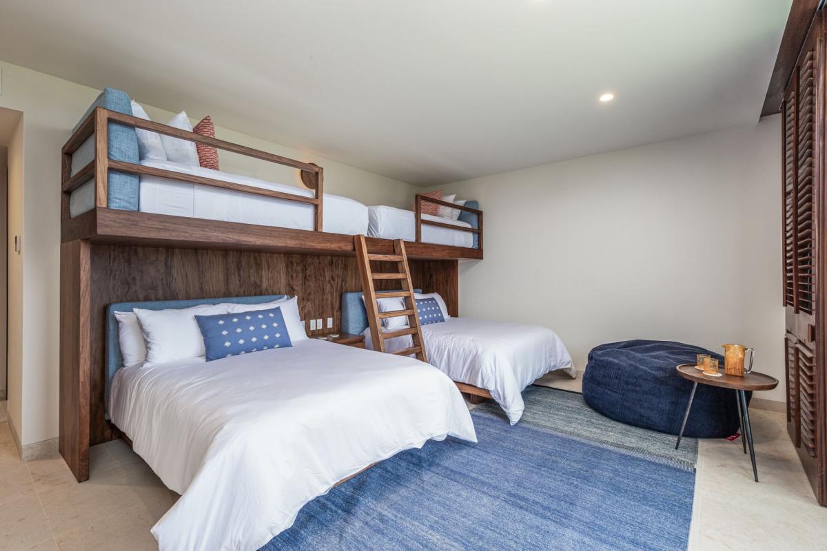 Bedroom 3: 2 Queens (each with a single bunk above, ideal for kids), TV, AC, oversized beanbag, double closet, balcony with ocean view, outdoor furnishings, ensuite bathroom with double vanity, indoor shower, and bathtub.