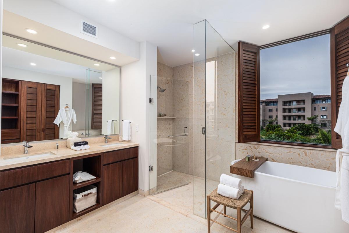 Bedroom: 1 King bed, TV, AC, double closet, balcony with pool and ocean view, outdoor furnishings, ensuite bathroom with double vanity, indoor shower, and bathtub.