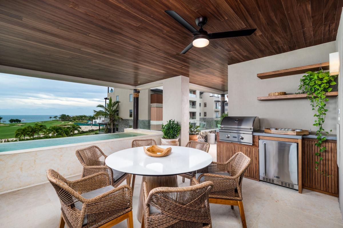 Perched on the second floor of Tau Residences, Tau 621 presents awe-inspiring ocean views from each bedroom and the outdoor balcony. This newly built, finely furnished 3-bedroom, 3.5-bathroom condo offers both indoor and outdoor dining options, along with a secluded heated pool and gas BBQ grill. As part of Punta Mita resorts, this condo provides amenities such as an exclusive Punta Mita Premier Golf membership and privileged entry to prestigious beach clubs, all conveniently reachable with the included 6-seat golf cart. Another added benefit is the daily housekeeping service, complemented by your choice of family-style breakfast or lunch (additional costs for food and beverages).