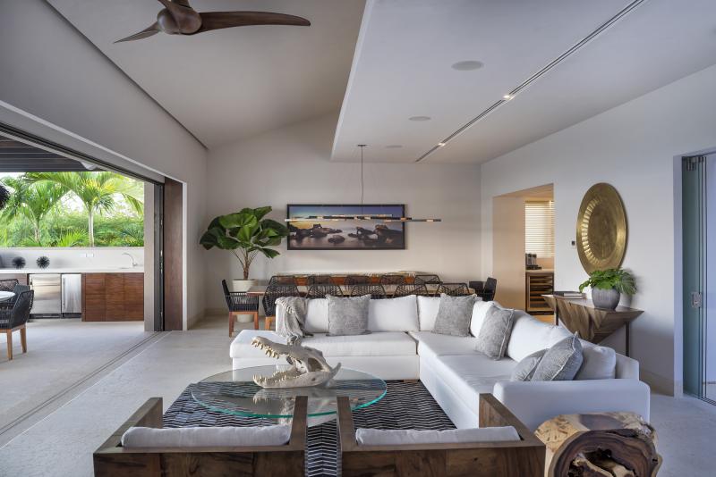 The indoor/outdoor living and dining areas overlook the pool and ocean. This is the perfect area for entertaining or relaxing. The spacious living/dining area features modern designer furnishings and opens directly to the pool terrace with fold-away glass doors.