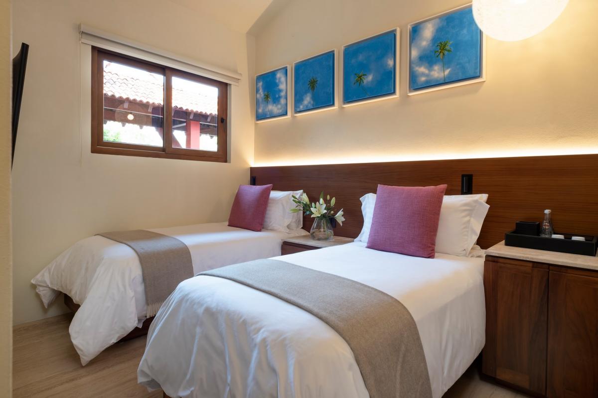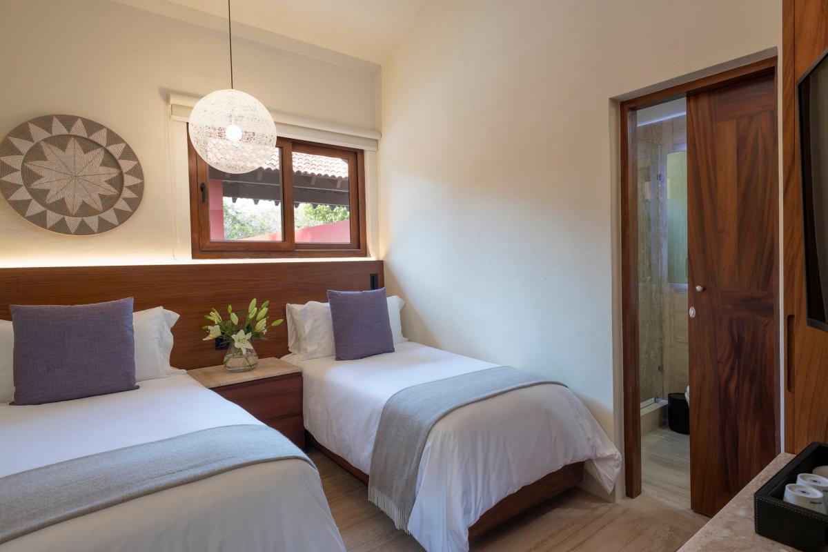 Bugambilias Suite 2: This spacious garden view suite offers two full-size beds, a television and Apple TV, personal security safe, an in-room minibar, a Nespresso® Coffee maker, and an ensuite bathroom with shower. The private patio offers a seating area and an outdoor shower. This suite can convert into One King Size and One Full-Size Bed or a double-size king bed with custom bed linens and is an excellent room to accommodate several younger guests.