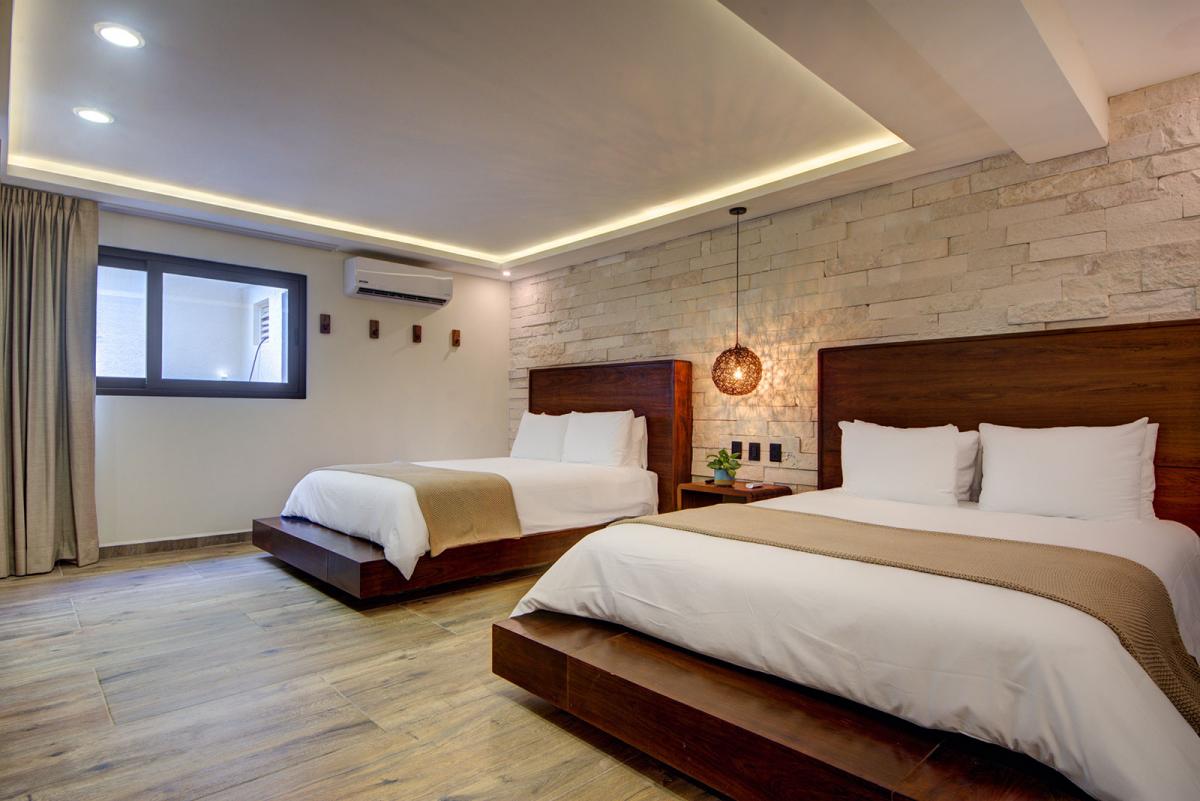 Playacar Vista Estate is an exquisite retreat in Riviera Maya, seamlessly combining two neighboring villas, Vista Hermosa and Alta Vista, to accommodate up to 32 guests across 16 luxurious bedrooms. Each villa features stunning rooftop pools that overlook the pristine beaches of Playacar, creating a perfect setting for sunset cocktails and lively barbecue gatherings. The villas beautifully blend modern elegance with rustic wooden details, fostering a relaxed and tropical ambiance ideal for creating unforgettable memories.