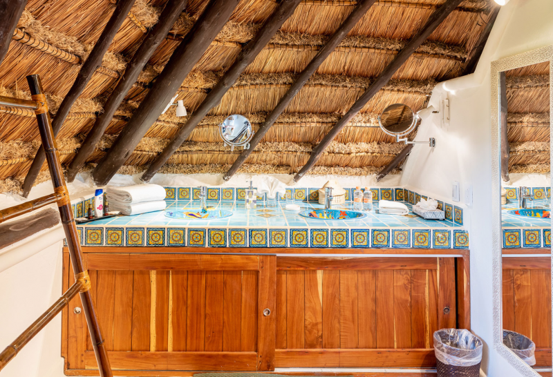 On the top floor, under the palapa, a Caribbean atmosphere is assured. You will discover a large King bedroom with en suite bathroom. It also has a private terrace where you will enjoy the beautiful picture-frame view of the bay.