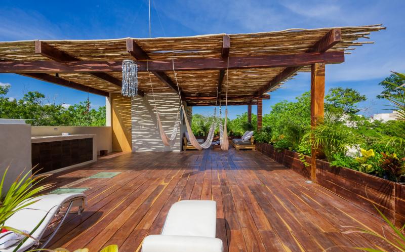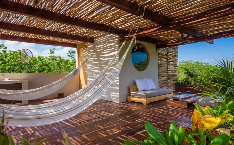 - Bedroom 4: King bed, en suite bathroom with shower, balcony, closet, hammock, kitchenette, mini fridge