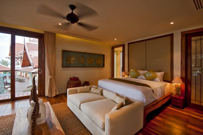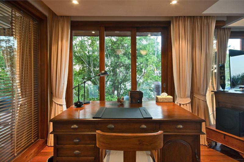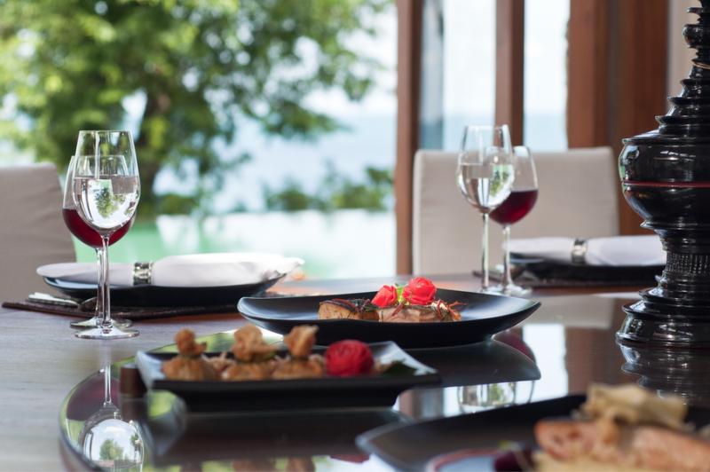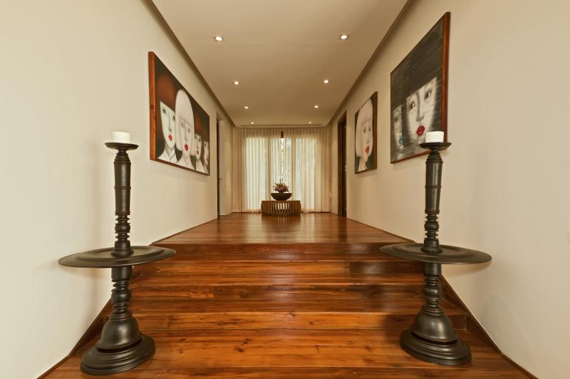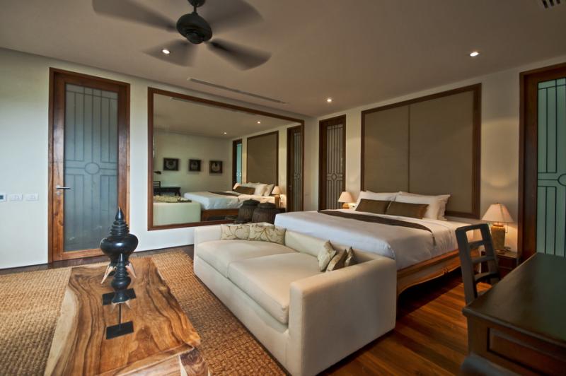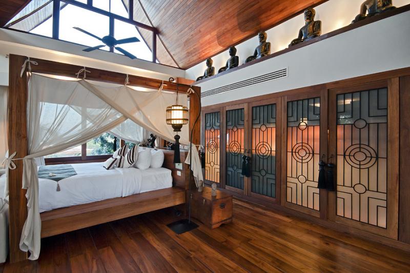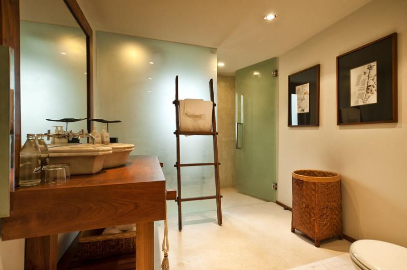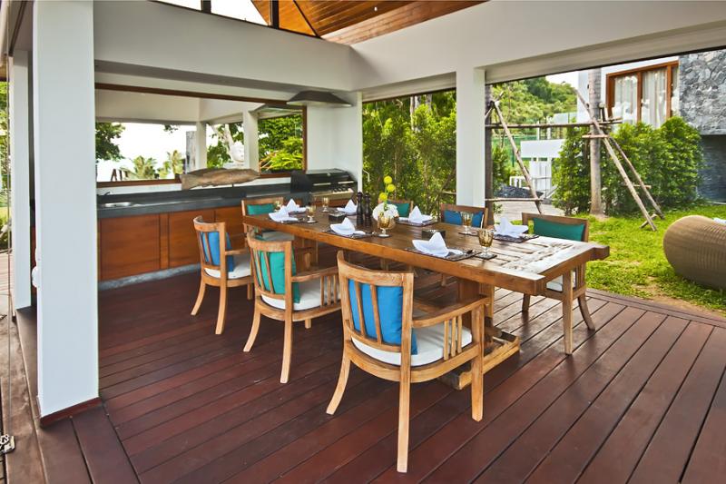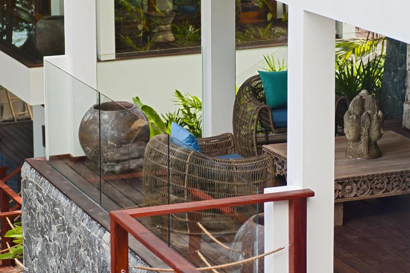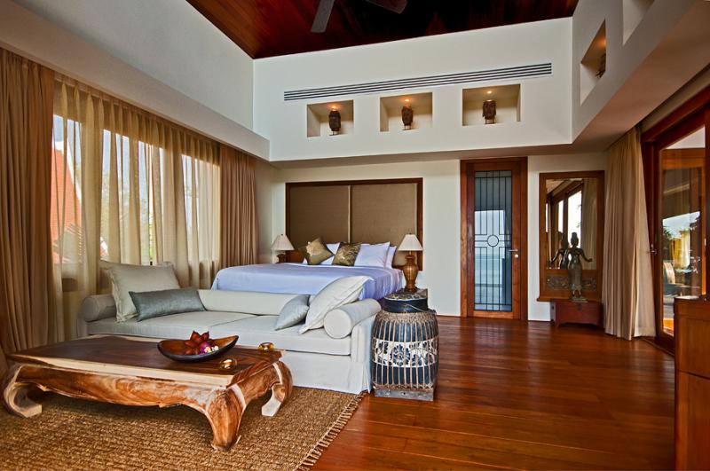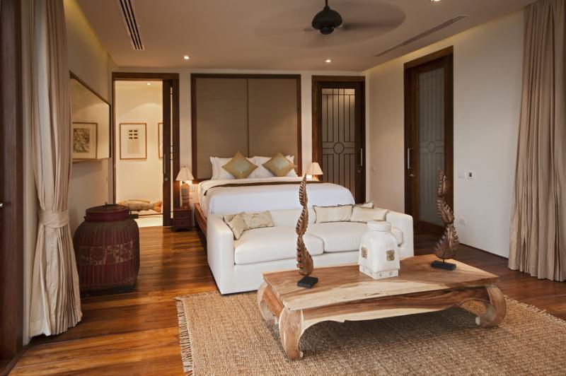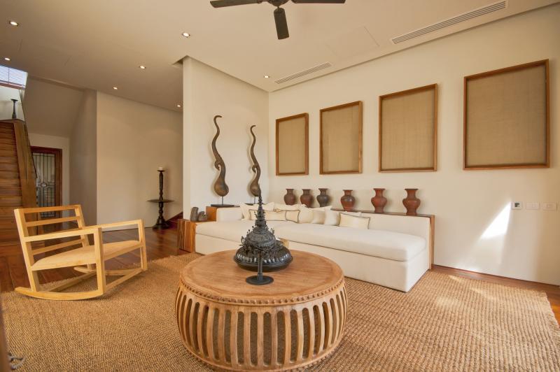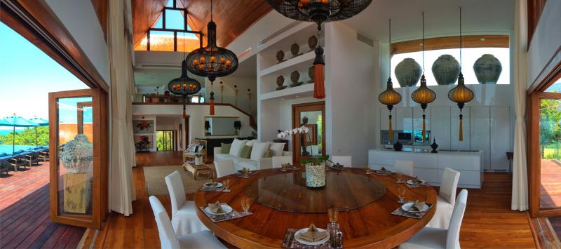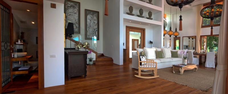 The main level begins with a majestic, stone-clad entrance that opens into a vaulted lounge and dining area furnished with fine contemporary Asian art and decor with wood and glass doors opening onto the large pool deck. The lounge extends into a spacious dining room with a 16-seater round solid Teak table, served by a fully fitted western show kitchen. A separate wet kitchen allows the staff to unobtrusively prepare meals for the guests.