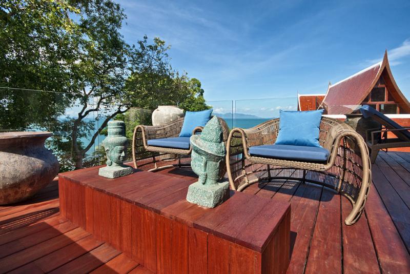The Clubhouse opens onto a wide wooden multi level sun deck that is furnished. The main deck hosts sun loungers that borders the 32 meter infinity pool with built-in 8 person jacuzzi while the lower deck and its seaview boats several sofas. One side of the deck also features a roofed poolside relaxation sala or gazebo, while a second furnished sala is positioned as an ideal location for a BBQ for al fresco meals and drinks prepared by the private chef and the villa team.