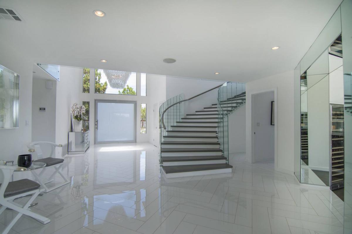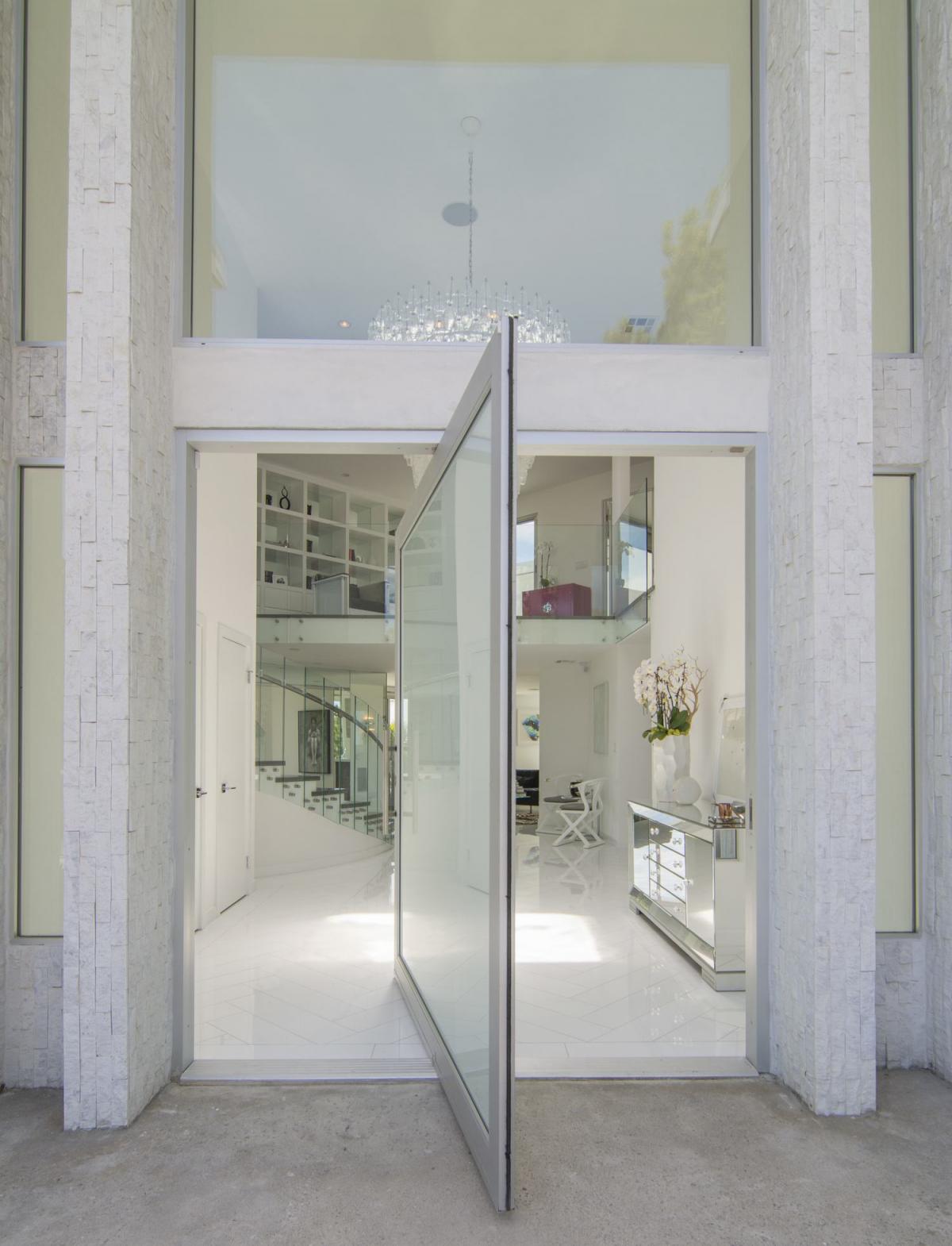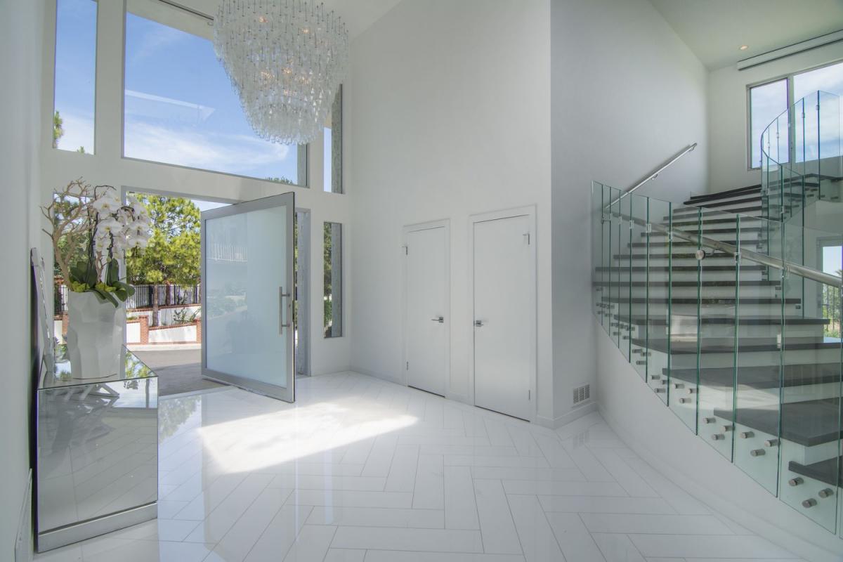 Enter Venus Modern through the grand entry boasting Venini chandelier and curved glass staircase. The indoors flow seamlessly to the outdoors with the living room, pool/spa, grassy yard, custom kitchen complete with Miele appliances and all the light you could need.