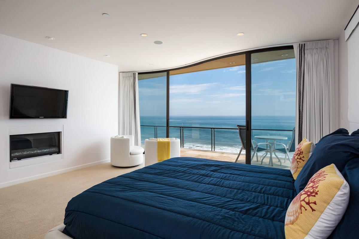 Primary: King size bed, Ensuite bathroom with stand-alone shower & jetted bathtub, Dual vanity, Bidet, Walk-in closet, Television, Safe, Air conditioning, Decorative fireplace, Balcony, Outdoor furniture, View of the Pacific Ocean