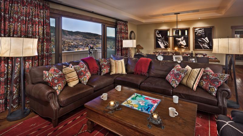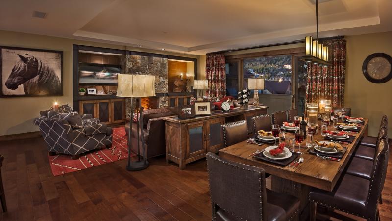 The Sugar Loaf Mountain Residence features a large living area with mountain and valley views, and its open floor plan connects the living and dining areas to the kitchen, with plenty of room for the entire group. State of the art a/v equipment provides hi definition entertainment after a full day of activity.