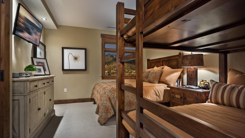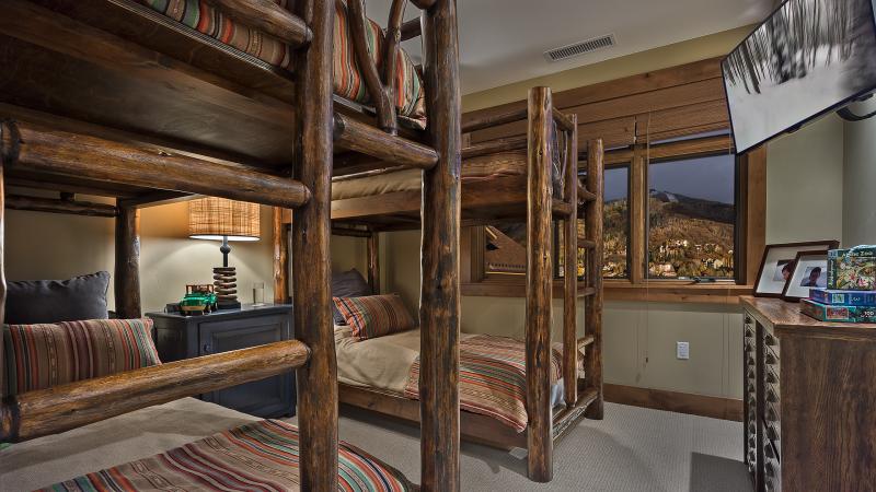 • Bedroom 4: Two twin bunk beds, private bathroom, TV
