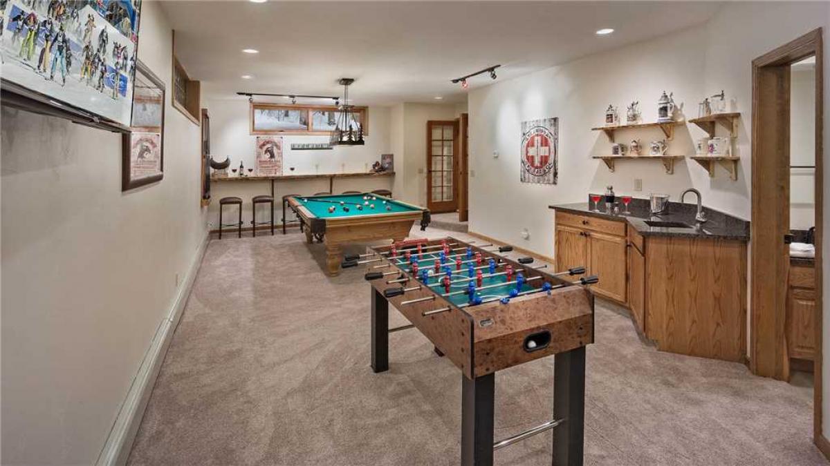 The lower level features a fully upgraded media room including a 75" LCD TV with cable and Apple TV, pool table, and foosball. Entertain under the stars in the outdoor hot tub.