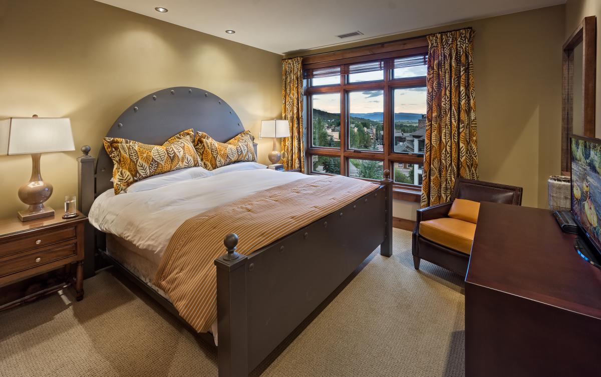 All One Steamboat Place residences feature rich colors, natural textures, and sumptuous fabrics throughout the home. Each master bedroom offers a gas fireplace. The main master bath features a steam shower and Jacuzzi tub and bidet. In this residence 3 bedrooms offer a King bed with private bath, and the fourth offers a Queen bed and bunks with two full beds, all with a private bathroom - great for kids.