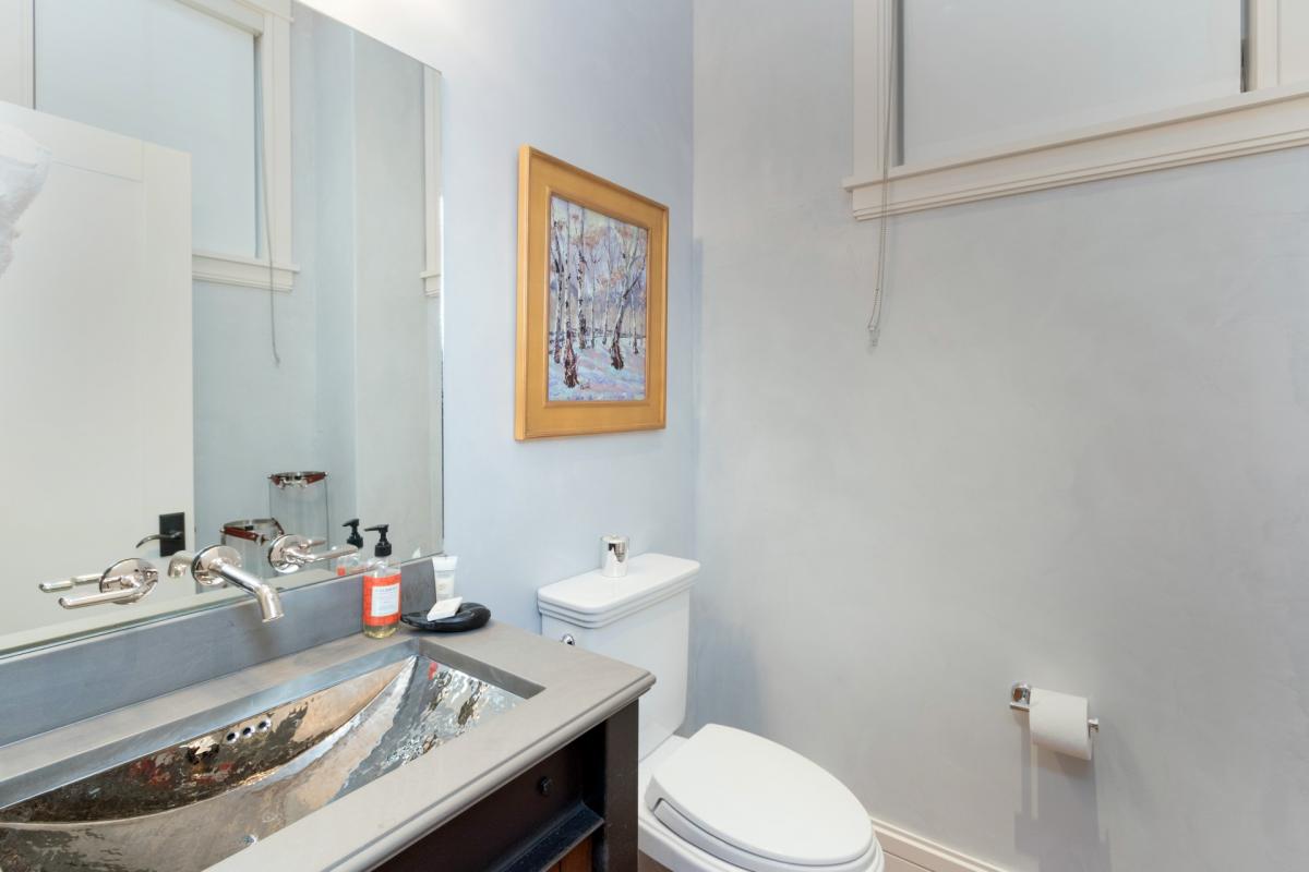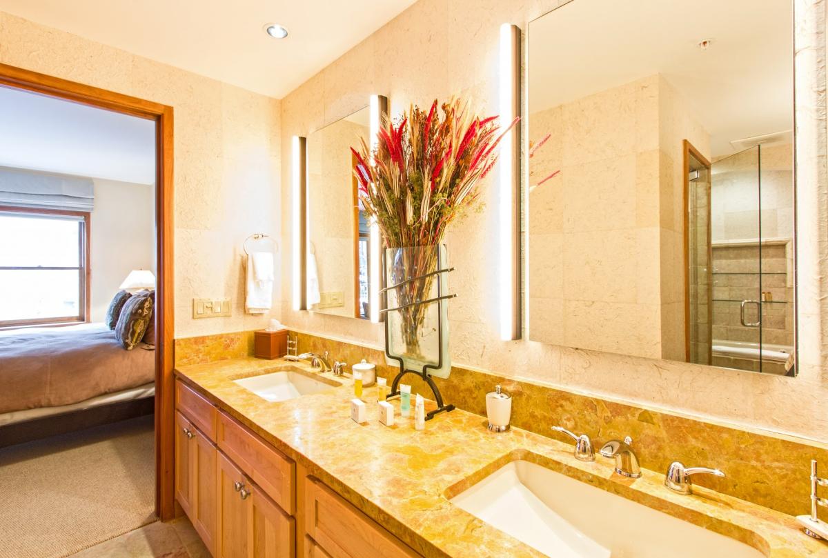 This residence's main entrance leads guests to a small foyer with a large bench, opening up to a lovely living area where guests enjoy comfortable seating, breathtaking views, a gas fireplace and large flat screen TV with DVD/Blue Ray player. The gourmet kitchen features high-end appliances as well as beautiful soapstone countertops. Off the great room is a private balcony with a gas grill and the same great views as the living area. Around the corner from the living room is the dining room with seating for 10 guests, as well as a small powder room.