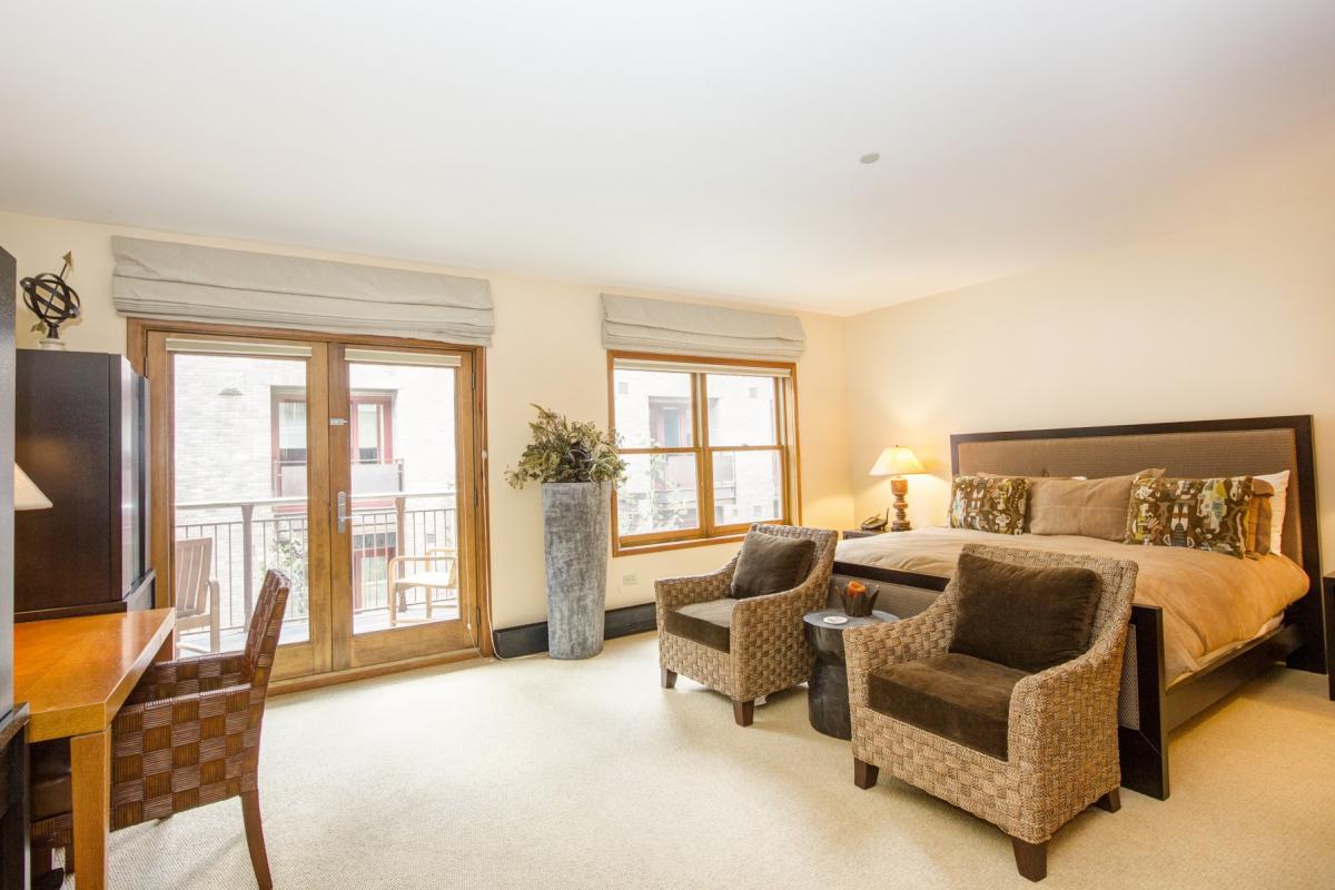 The second entrance to the property opens to a series of three bedrooms. All bedrooms share one balcony, which overlooks the property’s fire pit and common area. The queen guest suite is spacious and can sleep up to four guests in a queen size bed and an additional twin bed with trundle underneath. The queen guest suite includes a flat screen TV/DVD player, as well as an en suite bathroom with a jetted tub/shower combination. Continue down the hall to the king guest suite, with another flat screen TV/DVD as well as an en suite bathroom with a jetted tub and shower. At the end of the hallway, find the king master suite; a beautifully appointed room with a king size bed, small sitting area and flat screen TV/DVD. The en suite master bathroom includes a double vanity, jetted tub and a separate steam shower… perfect for après ski relaxation.