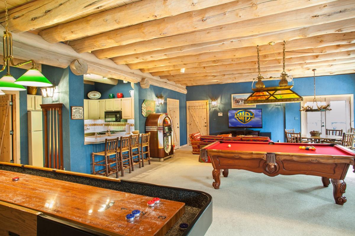 Hunters Lodge guests will delight in the lower level game room. This playhouse is equipped with a jukebox, theater quality popcorn machine, full-size pool table, and shuffleboard. Sit movie side and enjoy your favorite flick on the large flat screen TV with Blu-ray. Guests can access both a full kitchen with bar, sauna, and the hot tub patio from the game room.