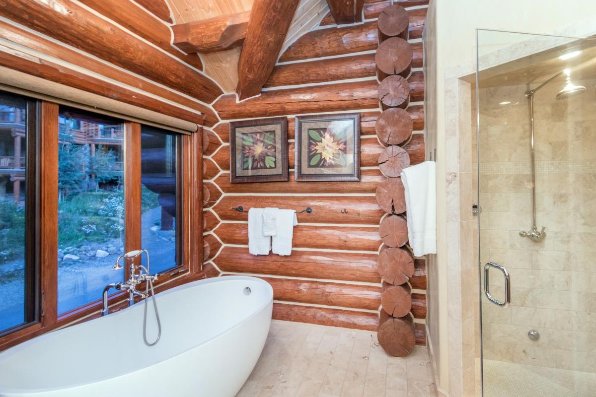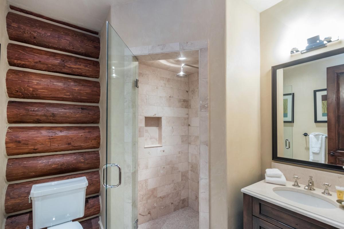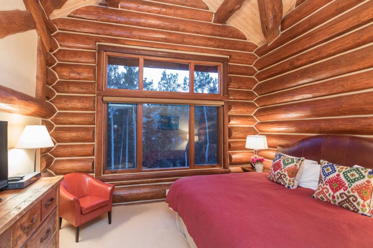 Heading up the wood stairs with iron accents guest marvel at the exposed logs and high ceilings which are found throughout the home. The first room off the staircase to the left is the bunk room with flat screen TV and custom-made snowboard shelving, while across the hall are the two master suites. The first is furnished with a king bed, flat screen TV, walk-in closet and views from the large picture windows that take up almost the entire north wall of the room. An en suite bathroom with white stone tiling and countertops, large glass shower with waterfall shower head and Venetian plaster walls finish out this beautiful space. Next door is the second Master Suite with hardwood floor, vaulted ceilings, exposed wood beam walls, large north facing window, flat screen TV, walk in closet and generous master en suite bathroom. White stone and beautiful exposed wood create a tranquil space when combined with the large freestanding soaking tub, glass shower with waterfall shower head and dual vanity sinks.