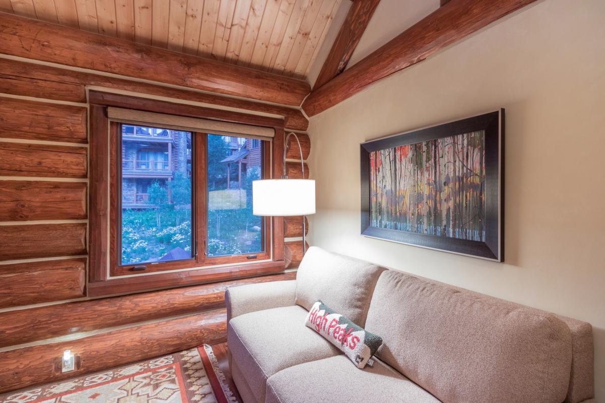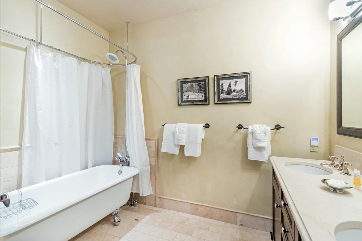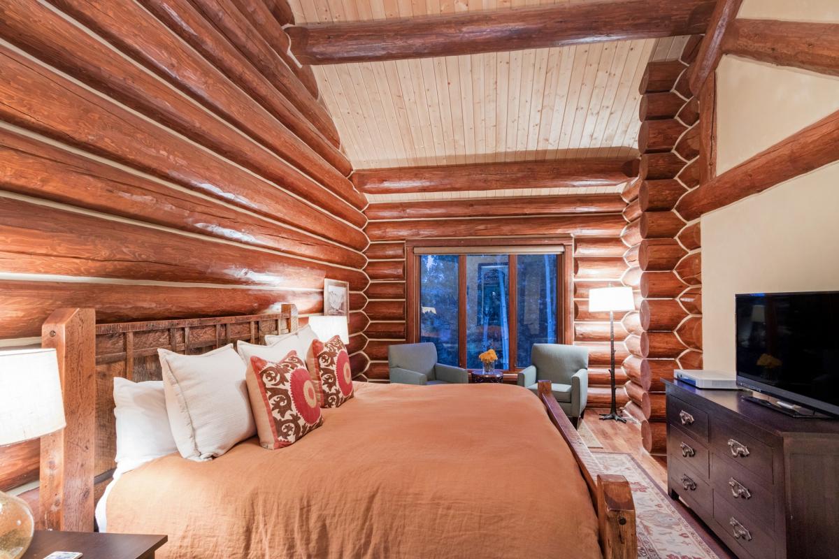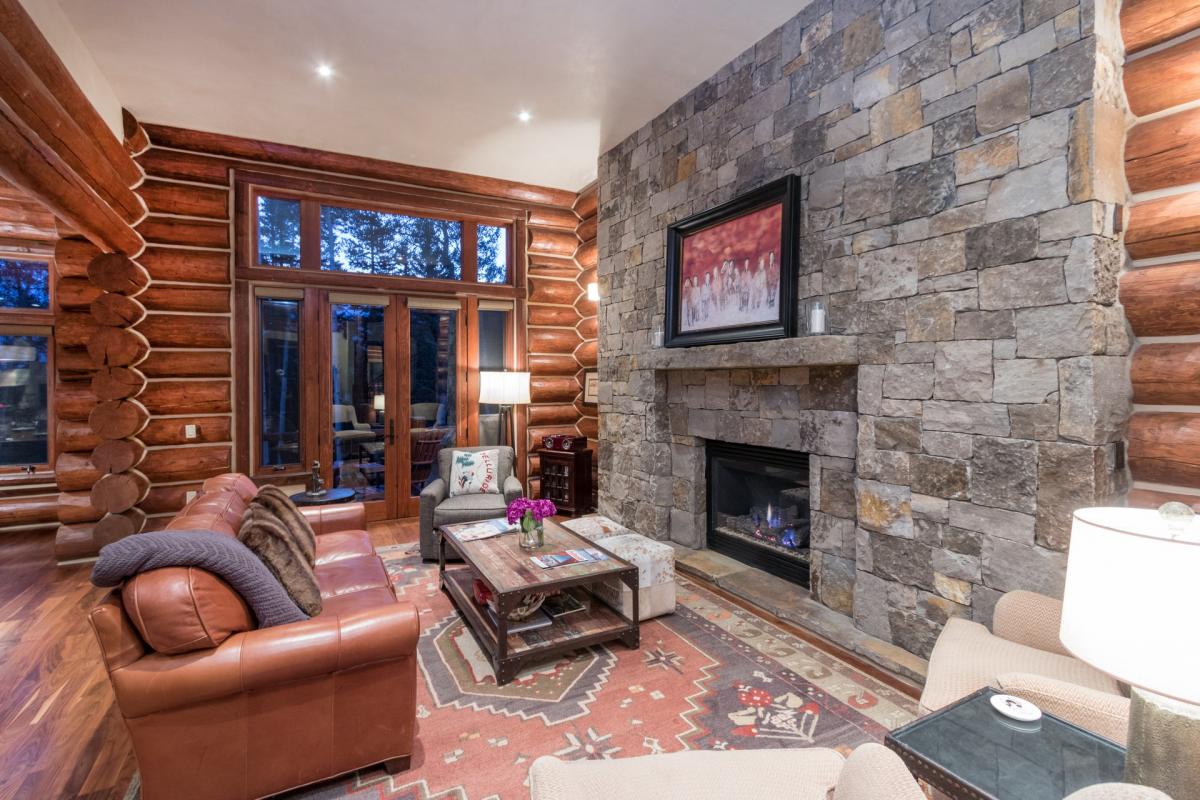 Heading up the wood stairs with iron accents guest marvel at the exposed logs and high ceilings which are found throughout the home. The first room off the staircase to the left is the bunk room with flat screen TV and custom-made snowboard shelving, while across the hall are the two master suites. The first is furnished with a king bed, flat screen TV, walk-in closet and views from the large picture windows that take up almost the entire north wall of the room. An en suite bathroom with white stone tiling and countertops, large glass shower with waterfall shower head and Venetian plaster walls finish out this beautiful space. Next door is the second Master Suite with hardwood floor, vaulted ceilings, exposed wood beam walls, large north facing window, flat screen TV, walk in closet and generous master en suite bathroom. White stone and beautiful exposed wood create a tranquil space when combined with the large freestanding soaking tub, glass shower with waterfall shower head and dual vanity sinks.