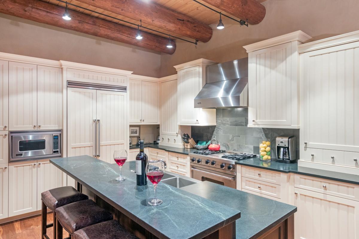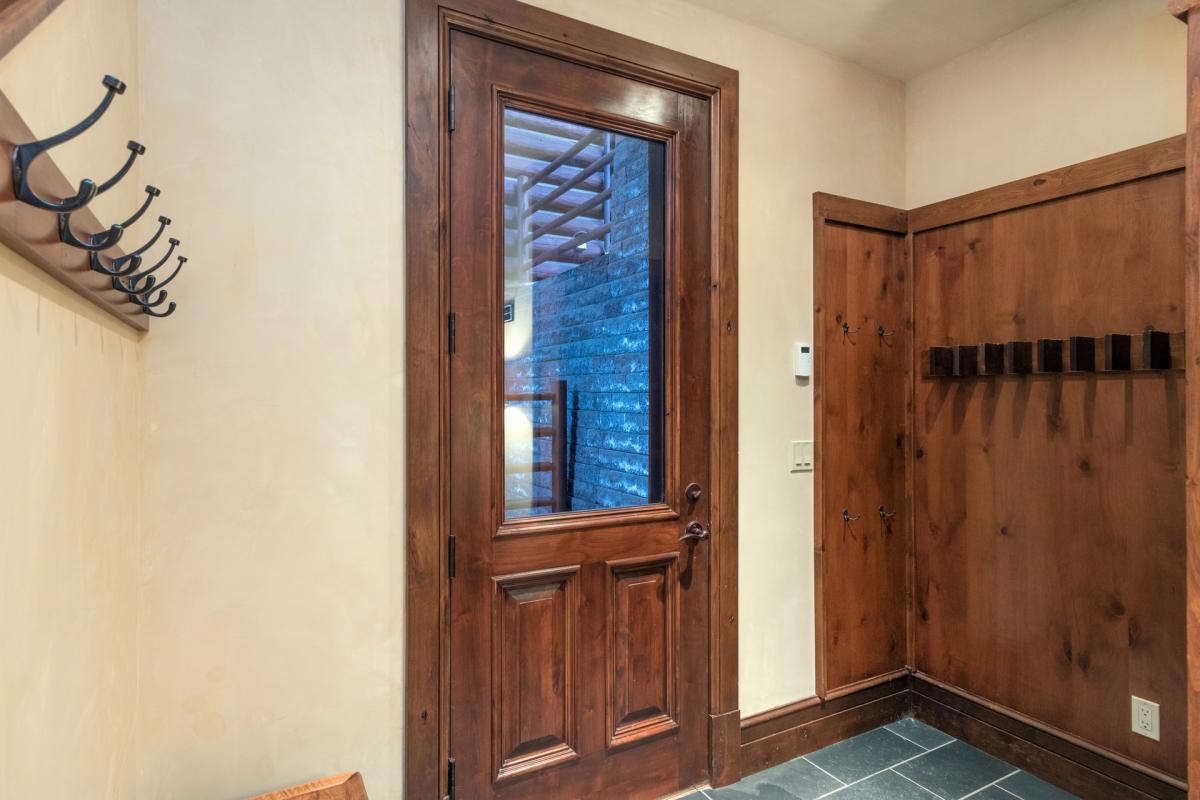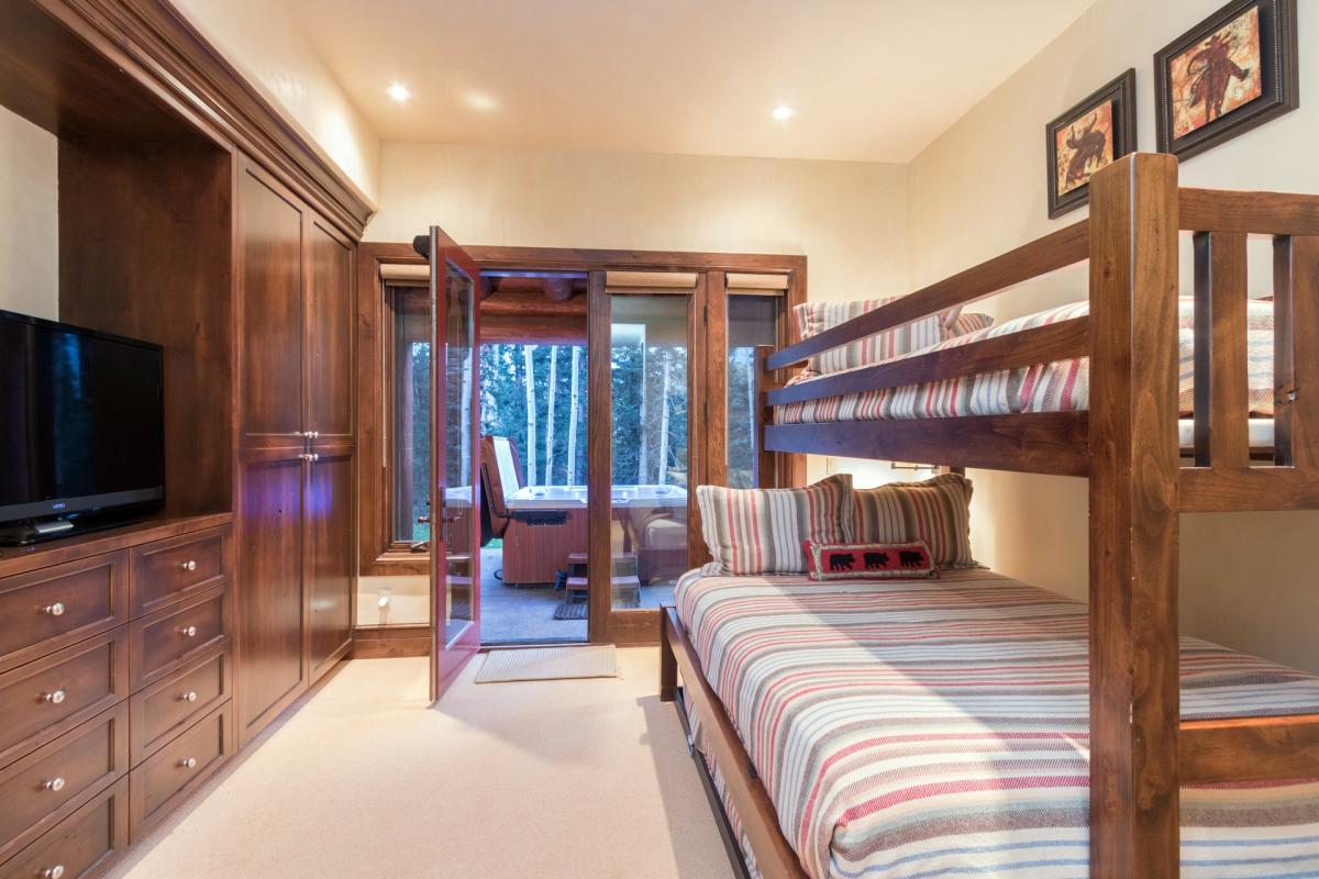 Following the stairway down past the main entrance onto the ground floor, where guests will find the entertainment den, decked out with a leather couch and chair surrounding a large flat screen TV with DVD player. A side entrance is found here with a bench and additional seating just inside with cubbies and ski racks, opportune for storing gear after a day of skiing. Just next to the media room is an extra-large washer and dryer and utility sink in the home’s laundry room. Finally, the last two guest rooms can be found on this lowest level as well. Both fully carpeted with high ceilings, flat screen TVs, custom built-ins and windowed doors leading onto the deck with access to the home’s private hot tub. The first guest room is home to a captain’s bunk with a full size bed on bottom, twin on top and twin trundle bed underneath, as well as an en-suite bathroom with glass shower and waterfall shower head. The other is a split king guest room with en-suite bathroom boasting a shower tub combination and dual vanity sinks.