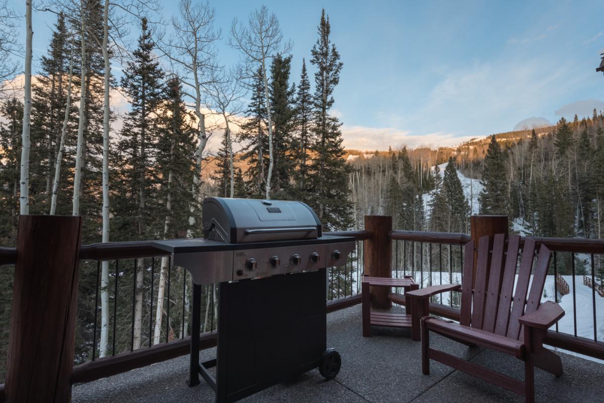 Walk under the traditional log eve through the impressive wood and glass doorway to find the natural light from the Colorado bluebird sky to follow behind. A coat rack made from vintage wooden skis sets the tone for this vacation destination. A guest bath with white stone countertops can be found just beside the door, in perfect convenience. The black slate floor of the foyer leads onto the hardwood floor of the open dining, kitchen and living space with high vaulted ceilings, exposed wooden beam walls and floor to ceiling picture windows. The door to the garage can be found to the right just before entering the living area. Centered around a large stone wall is a gas fireplace with leather sofa, three chairs, and two cow hide ottomans giving comfort and elegant to the space. French doors lead onto the deck with gas grill and seating to gaze upon the beautiful trees and mountains that surround. Beside is the kitchen with granite countertops, Viking stainless steel appliances, custom cabinets and a breakfast bar for four, making the perfect space for cooking and socializing. Adjacent is a dining table for eight surrounded by leather chairs and a wooden bench all overlooking the beautiful San Sofia Ridgeline.