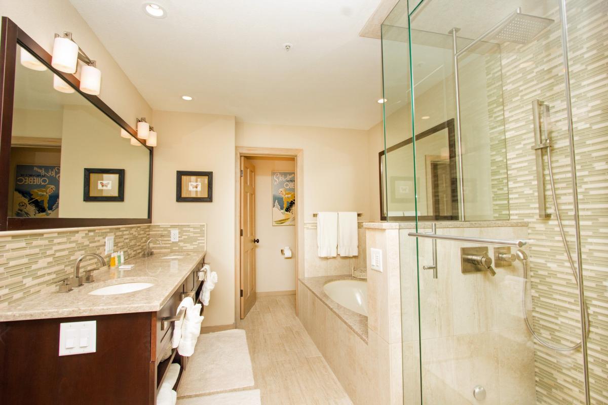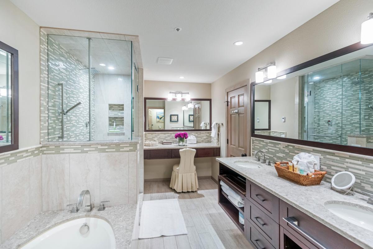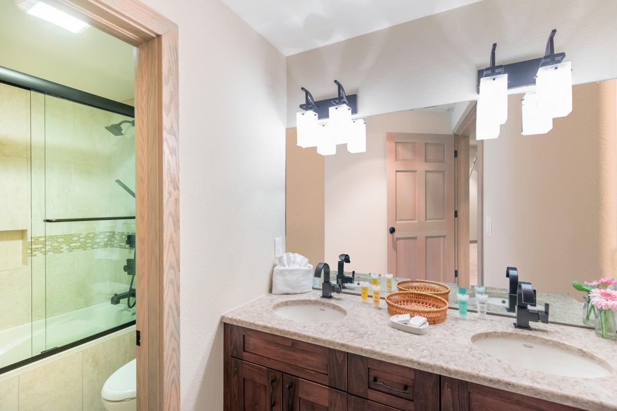 The additional two guest rooms are located on the lower level of this home. Both bedrooms include a flat screen television. One guest room offers dual queen beds with an en suite bathroom with shower/tub combo. The last guest room offers a relaxing sleep on a king size bed with an en suite bathroom featuring glass shower with dual waterfall shower heads.